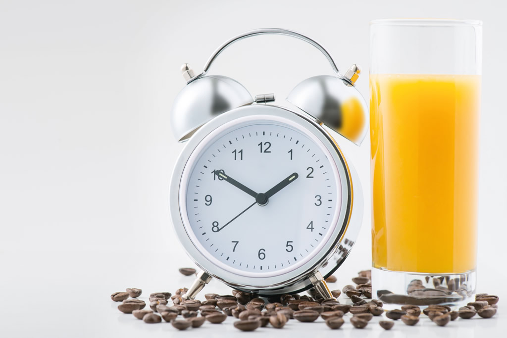次の写真は目覚ましい時計の商品写真です。目覚まし時計の背景として朝を連想させる珈琲豆とオレンジジュースを使っています。目覚まし時計単体の写真よりも、目覚まし時計が鳴り響く朝を連想させる背景を使うことで、より印象に残る写真になるということがわかってもらえると思います。