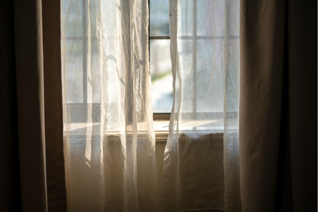 日差しをカットするのにはスタジオに置いてあるレフ板を使用してもよいですが、布だとカーテン代わりに窓に吊るすこともできます。