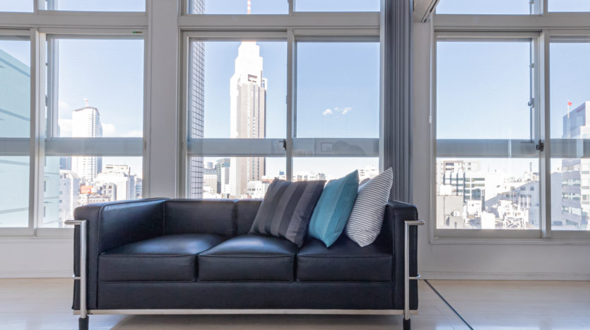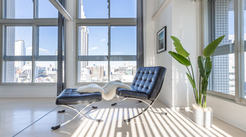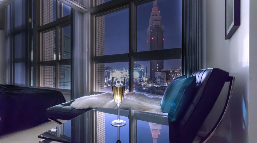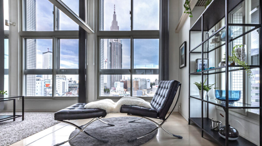 壁一面の大きな窓から見える新宿の景色が圧巻で三面からの採光できる自然光があふれる開放的なスペースです。4mもある天井高がさらに広がりをつくりだします。室内はスタイリッシュでモダンな高級感のあるインテリアで統一されており、大人な雰囲気を求める撮影に向いています。