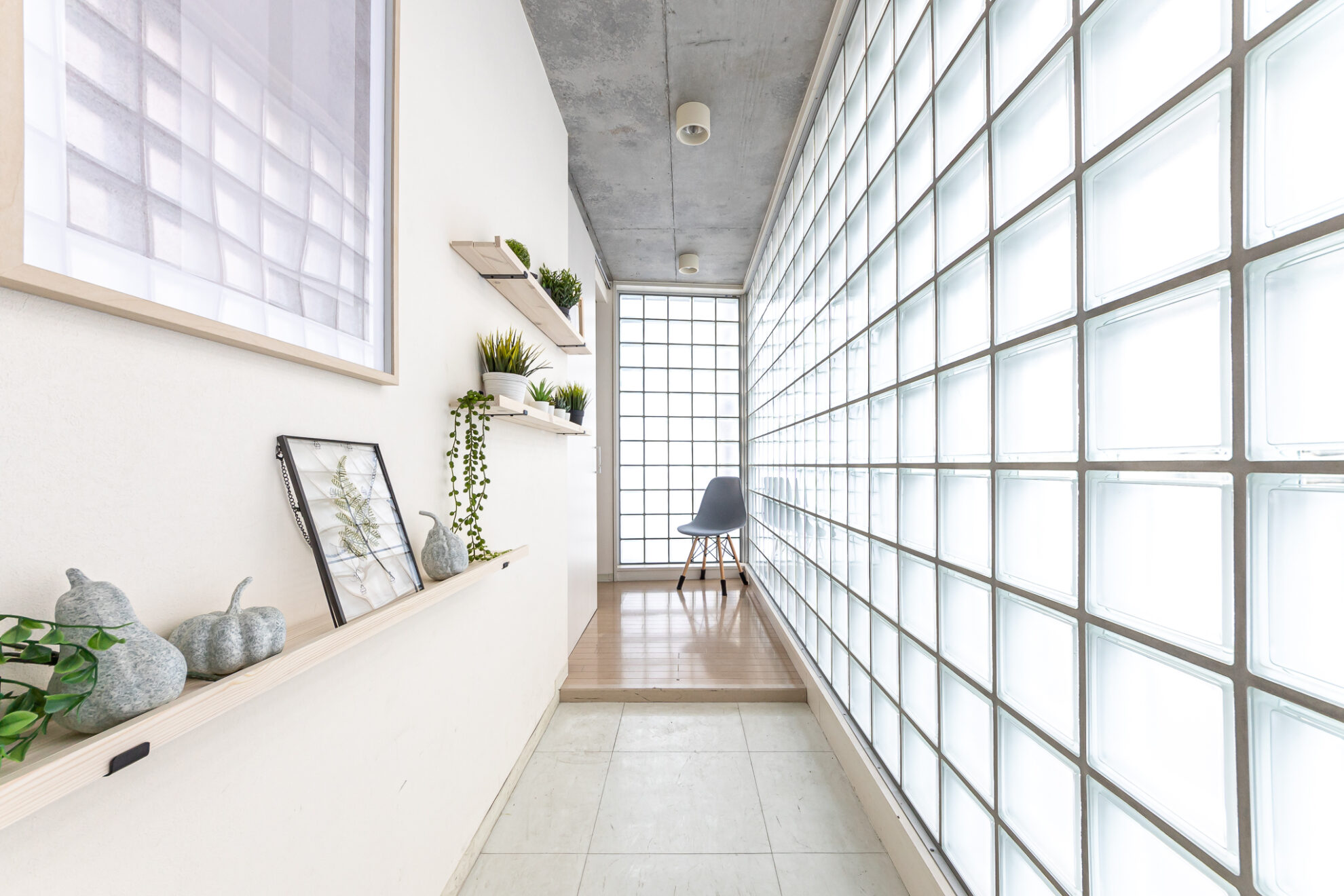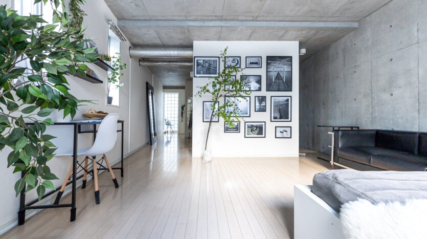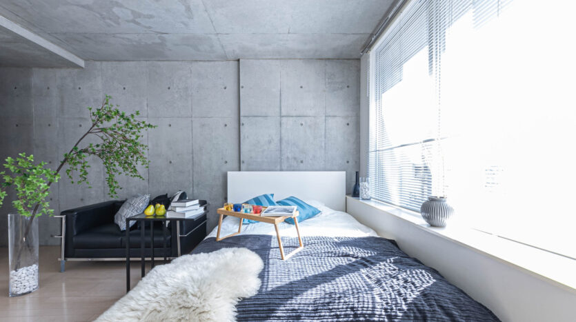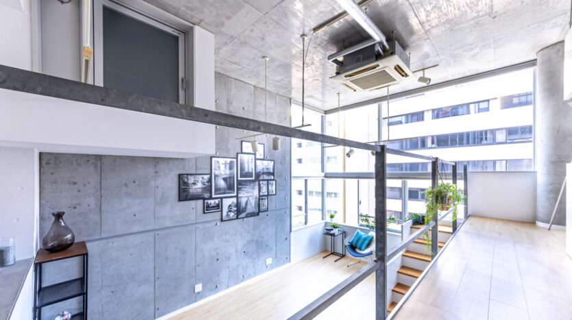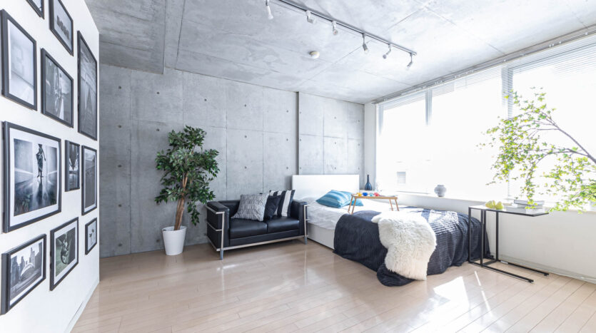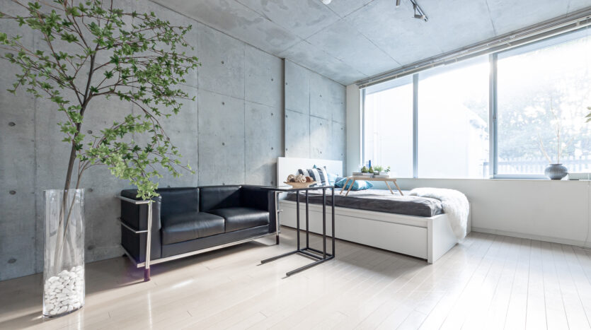 アパレル関係の撮影が多いこのエリアに適したコンクリート壁とスタイリッシュな家具類が都会暮らしをイメージさせ、二面採光で特徴的な大きなすりガラス窓から射し込む柔らかな自然光と豊富に並べられた観葉植物がコンクリートの無機質な空間を温かみのあるものに変えてくれます。