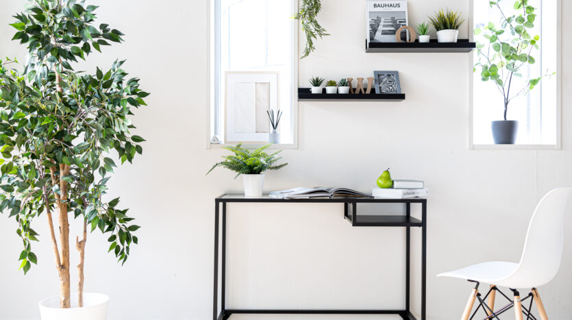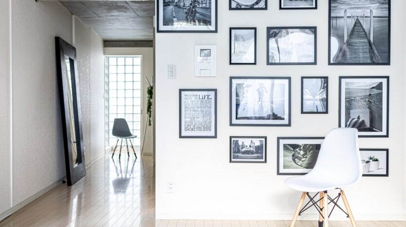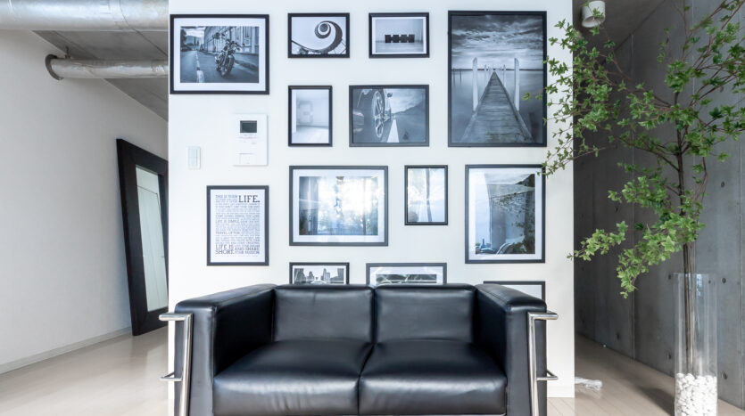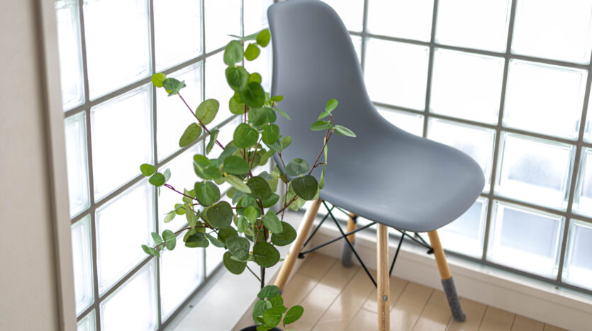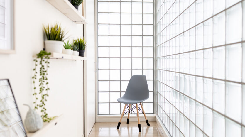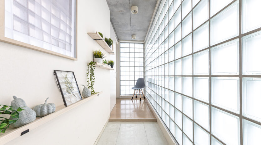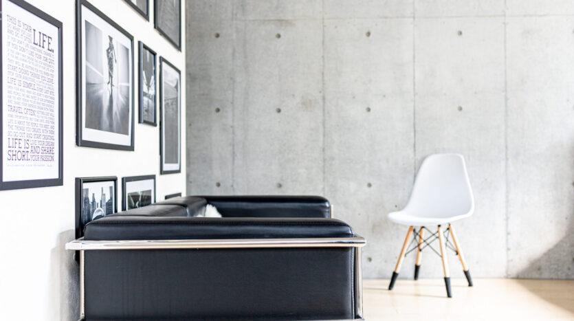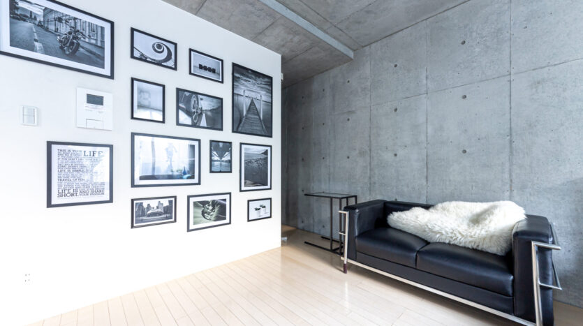 アパレル関係の撮影が多いこのエリアに適したコンクリート壁とスタイリッシュな家具類が都会暮らしをイメージさせ、二面採光で特徴的な大きなすりガラス窓から射し込む柔らかな自然光と豊富に並べられた観葉植物がコンクリートの無機質な空間を温かみのあるものに変えてくれます。