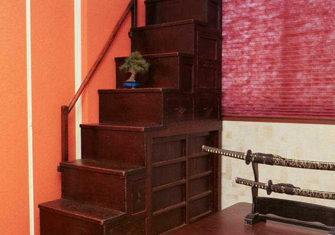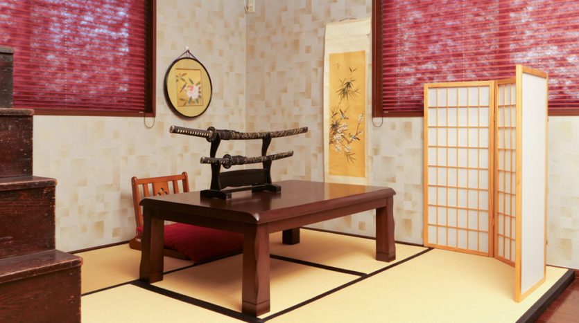 2階は、日本をイメージした撮影スペースです。畳風の床材で和室を表現されていて、ローテーブル、屏風、掛け軸、日本刀を模した小道具が印象的です。