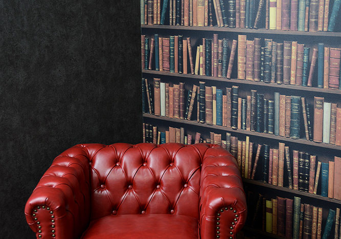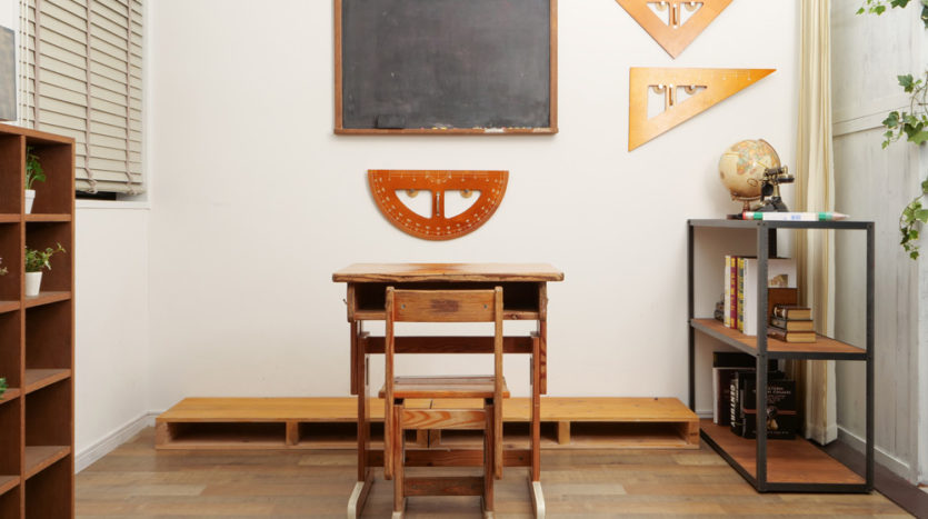 1階は教室をコンセプトとした撮影スペースとなっていて、机、椅子、黒板、足台などが用意されていて、大きな分度器と三角定規も壁に装飾されています。本や地球儀などの教室に関係するアイテムも。