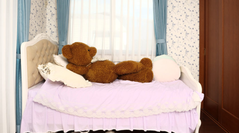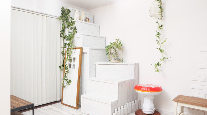 3階はホワイトと淡いブルーで構成された女の子ルームで、ふんわりとした可愛い空間です。大きなテディベアと一緒に撮影も可能。プレイルームには筋トレ器具やボールのプールをご用意しています。子どもを起用した撮影にもおすすめです。パソコンやキーボードなどオフィスを連想させる小道具などで統一されているスペースもあります。