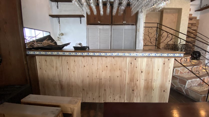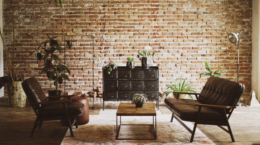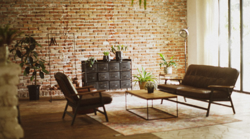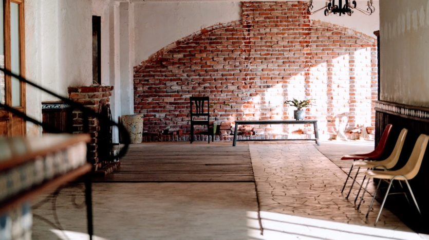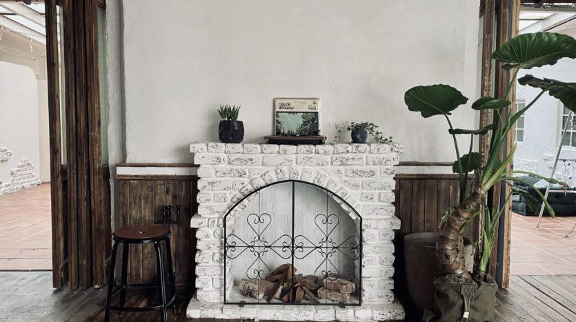 1階はレンガの壁と木材を使用したスペースとなっていて、温かみのある空間です。天井に飾られている木材が印象的で、白い北欧風な暖炉も設置されています。ほかにも、白壁のテラスやグレーの壁など、さまざまなシチュエーションに対応できるスペースをご用意しています。