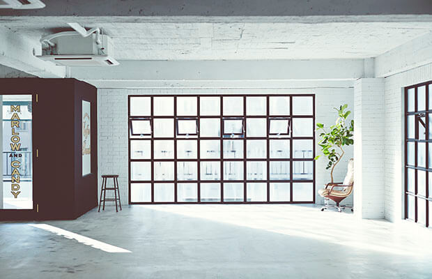 「MARLOW &CANDY」のロゴとレンガの外観が印象的な外国風撮影スタジオです。ホワイトの扉が映える、オシャレなデザイン。自然光が差し込む平坦で広々としたスペースとアメリカンなカフェを想像させるスペースが併設された内装です。ホワイトの壁と大きな鉄窓が特徴的。レイアウトによって、さまざまなバリエーションで撮影ができます。