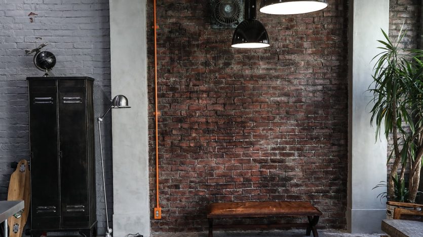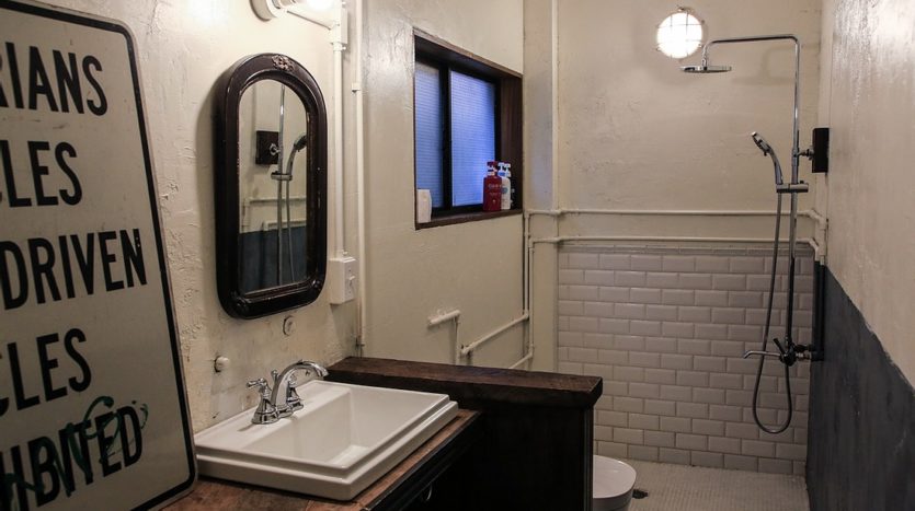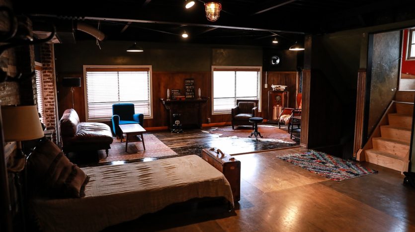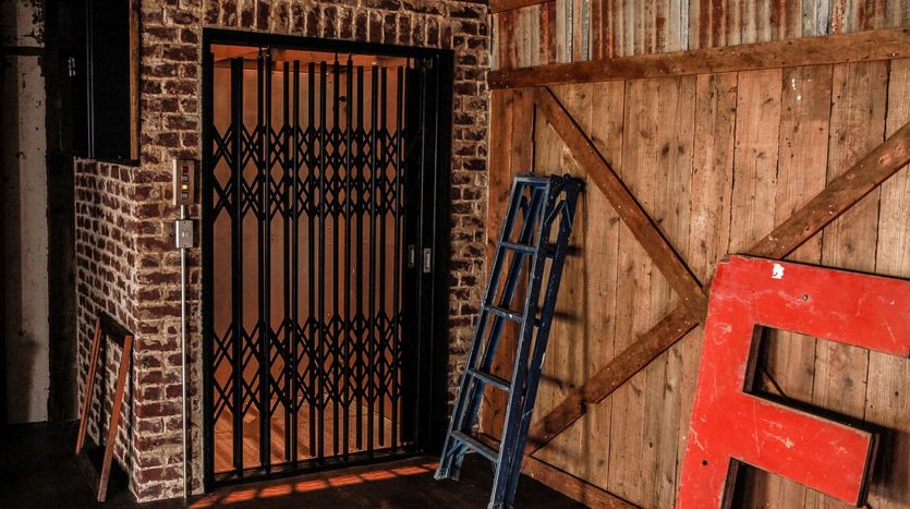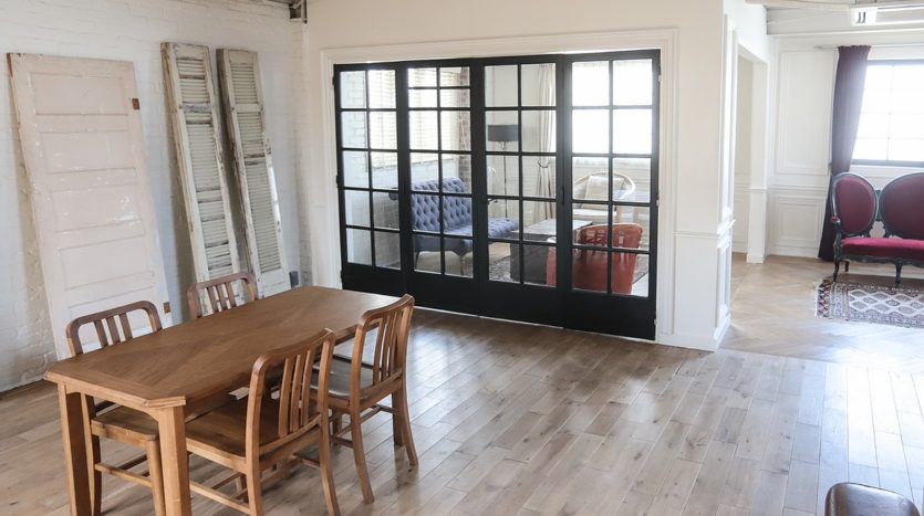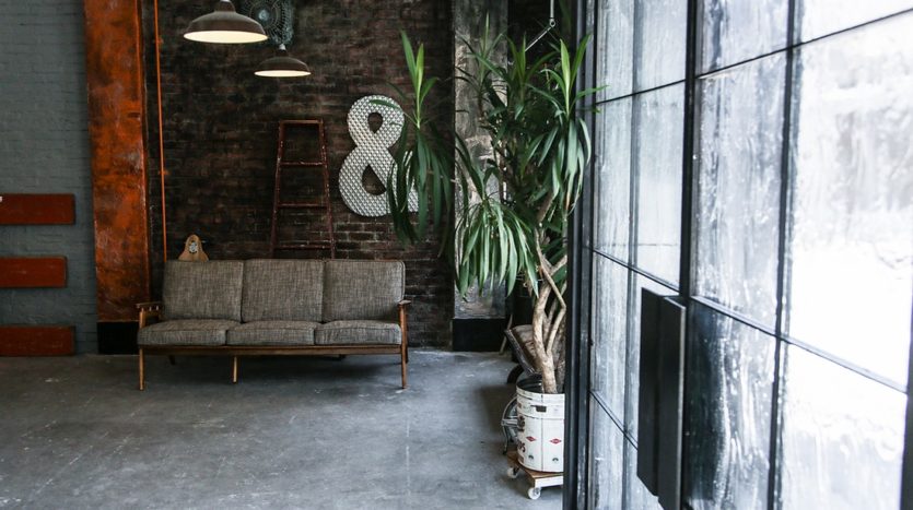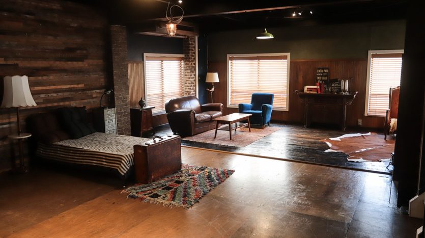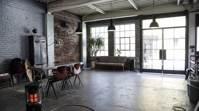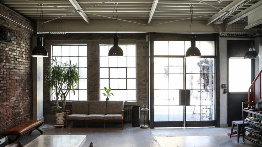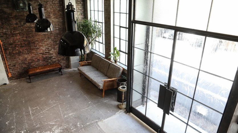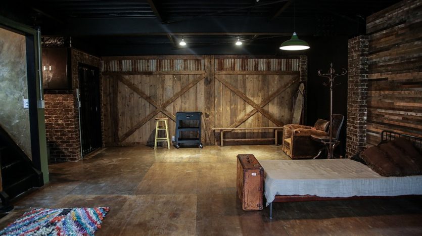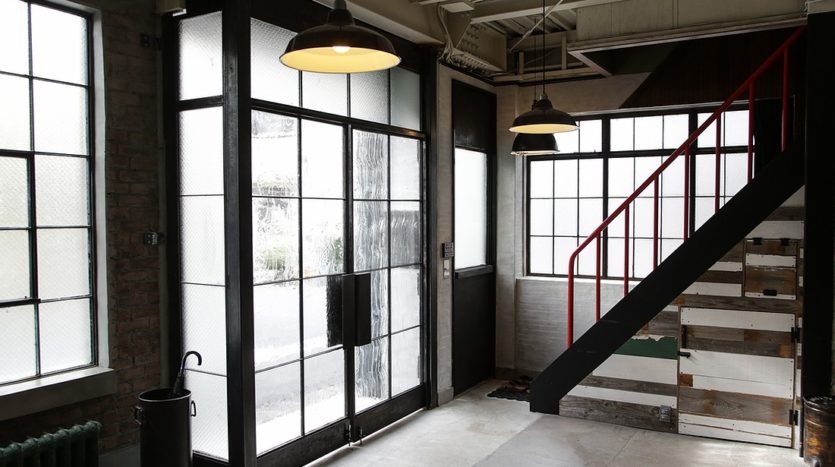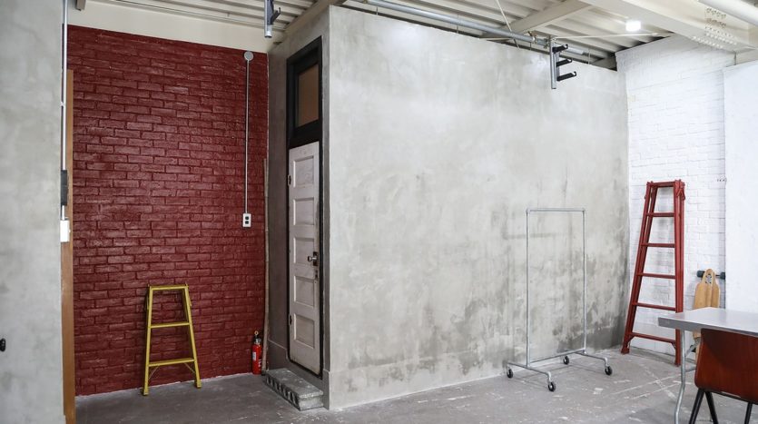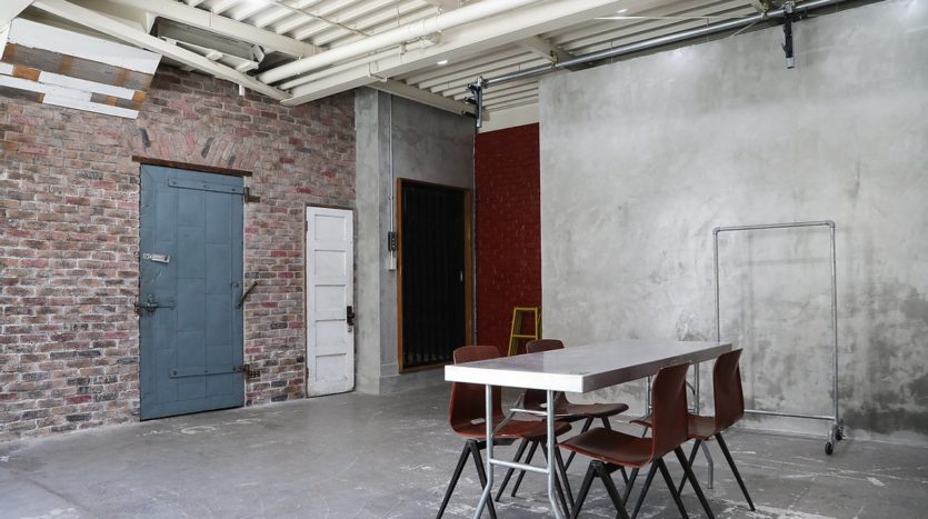 1階はバイクの乗り入れが可能で、倉庫風の建物にレンガ壁が印象的なNYブルックリンスタイルを実現できます。大きな両開きドアと窓があるので、自然光を取り入れた撮影もOK。大きな「&」のロゴや、ブルーやホワイトのドアもいいアクセントに。1階から3階の間で使えるリフトもあるので、機材等の搬入も楽々です。