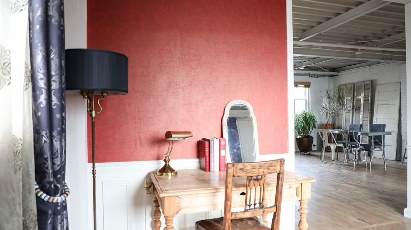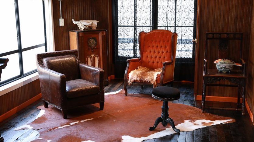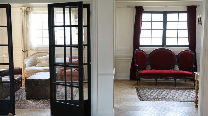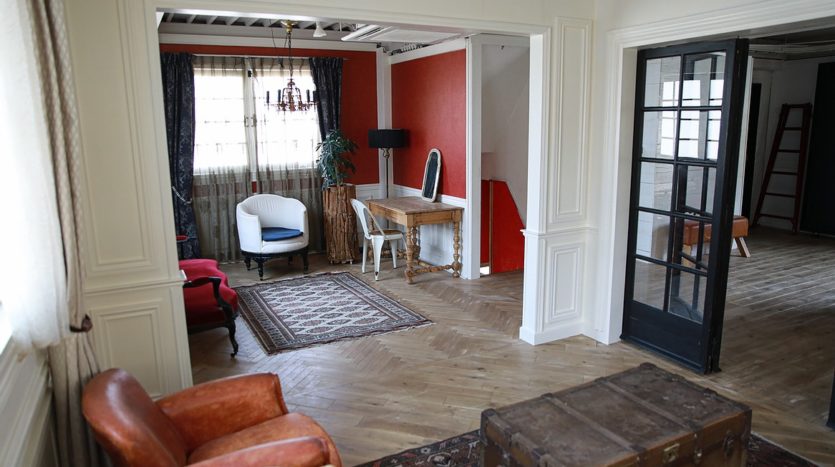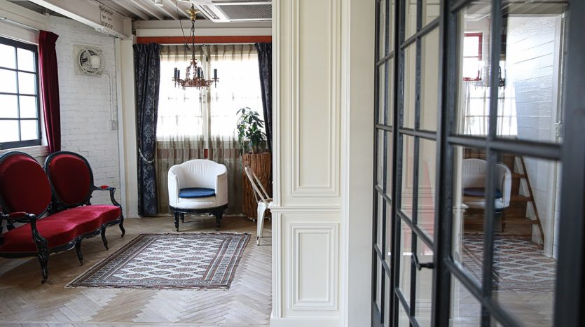 2階はアジアとヨーロッパの家具を使用したアンティークな雰囲気のあるフロアとなっていて、3階は天井よ壁がホワイトで明るい雰囲気のあるフロアです。フローリングの床に、高級感のあるラグ、ソファが目を引きます。