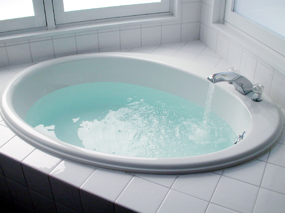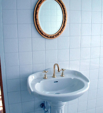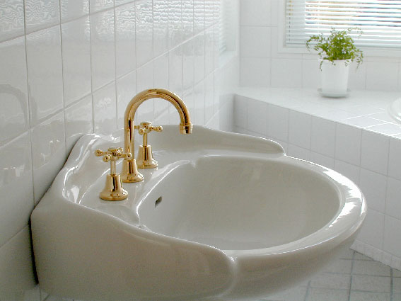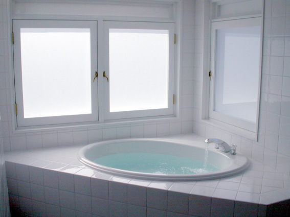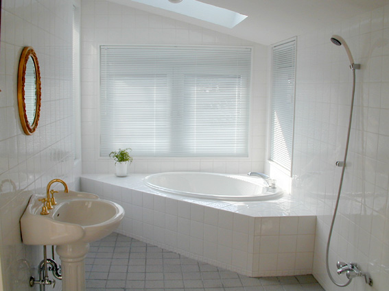 白を基調としたバスルームにも太陽光が入るので、優雅な空間を演出しながらの撮影が可能。コーラー社製の白いバスタブ、ホテル仕様のシャワー、ペデスタルタイプのクラシカルな洗面台など、清潔感あふれる設備も特徴的です。
