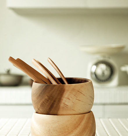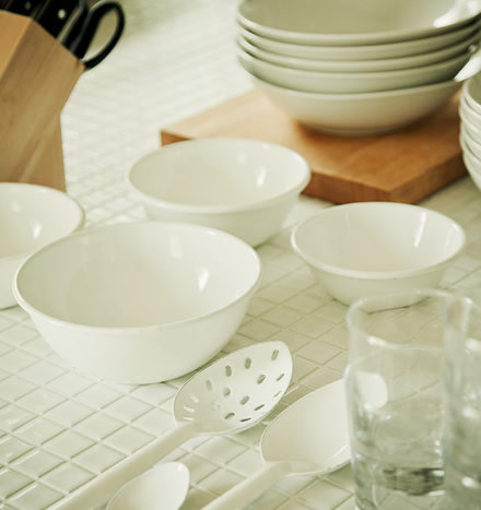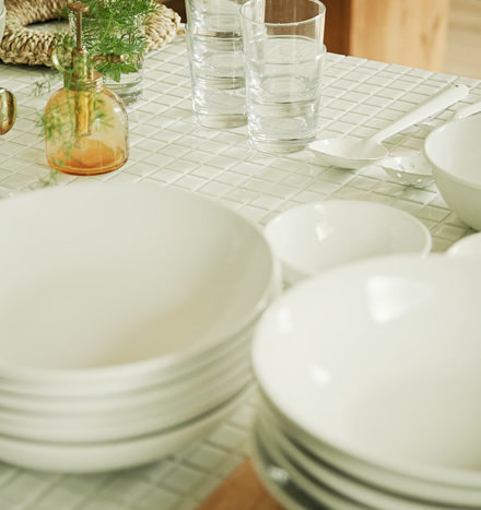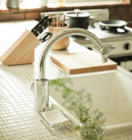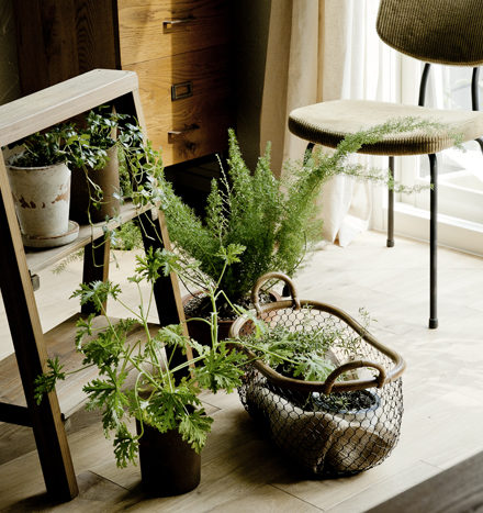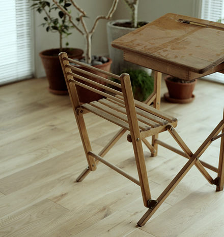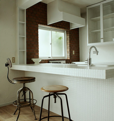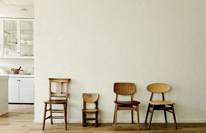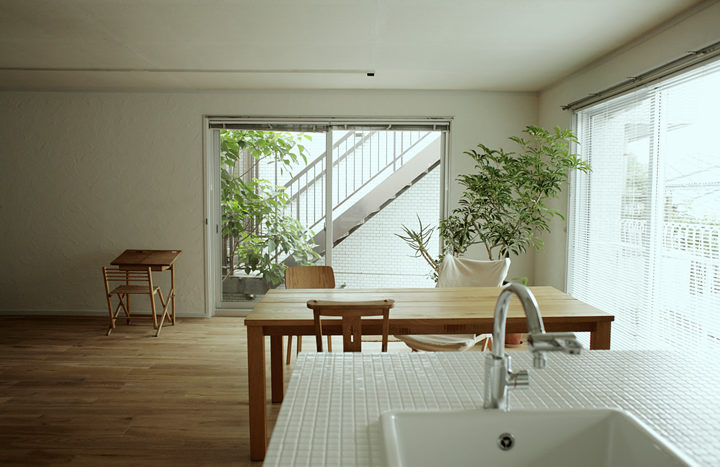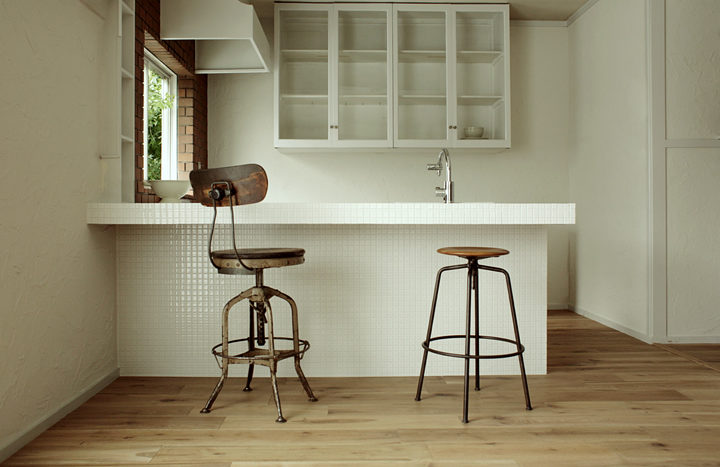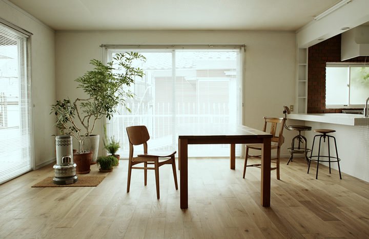 自然光がたっぷり入るリビングダイニングは淡いナチュラルカラーのフローリング床に白い漆喰壁。室内は木の質感を生かしたナチュラルな家具、インテリアで統一されています。キッチンスペースは白い小口タイルを貼りつめたキッチンが印象的。キッチン用品も豊富にそろっておりキッチンスタジオのような使い方もできます。