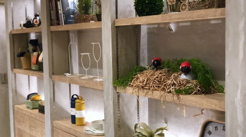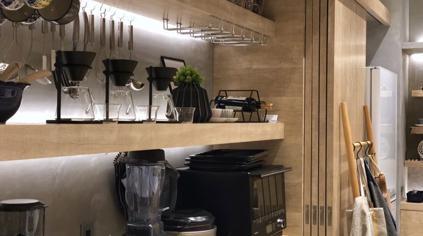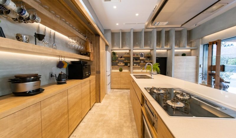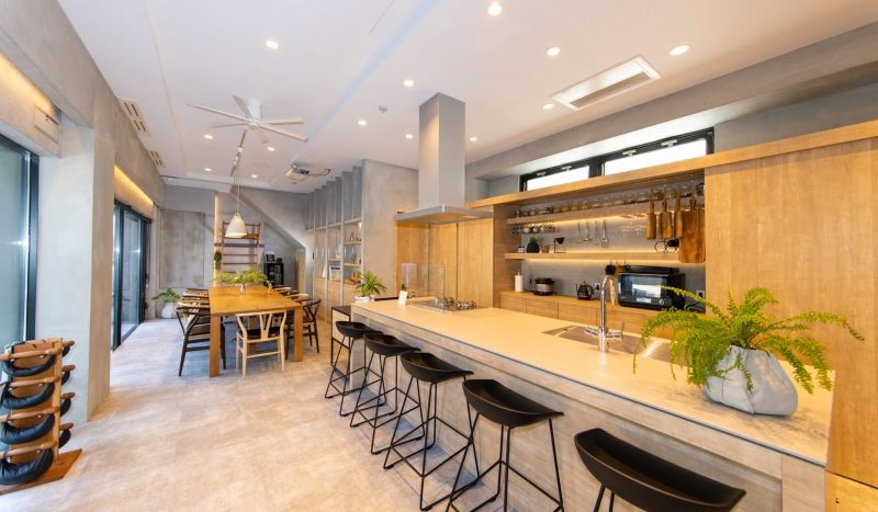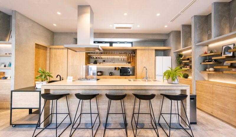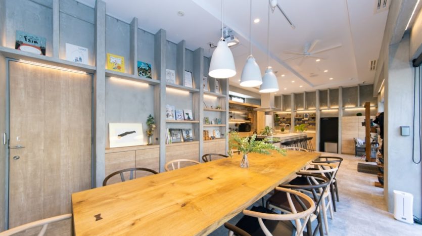 カウンターバーにもなるアイランドキッチンは、調理シーンや調理器具の物撮りに。12名着席可能な大きなダイニングスペースで女子会やパーティシーンの撮影に利用できます。室内の壁と床はコンクリートでグレイッシュに統一されており、おこにナチュラルな木の質感がセンスの良さを伺わせます。壁の収納に揃えられた一つ一つの小物もこだわりが見えるものばかりです。