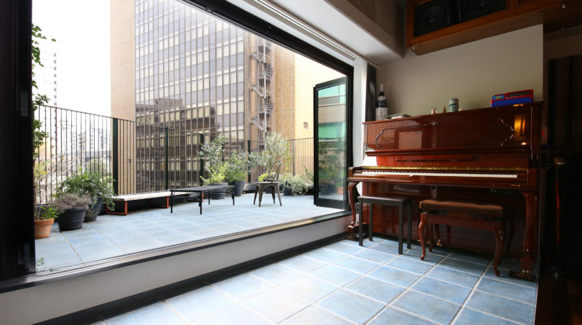 最上階ということもあり日当たりは良好です。ルーフバルコニーを使って空抜きの撮影もおすすめです。調理可能なアイランドキッチンが備えられ、キッチンスタジオとしても利用できます。そのほか、アップライトピアノが置かれており、こちらも利用できるなど、専用の撮影スタジオに引けを取らない内容です。