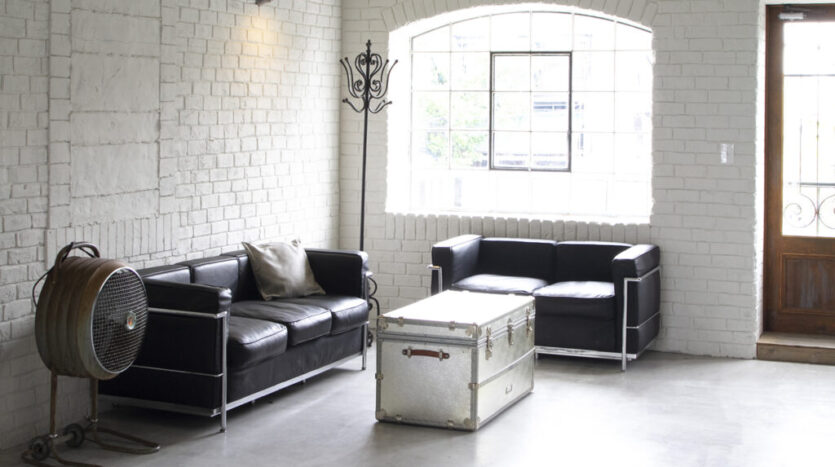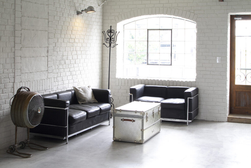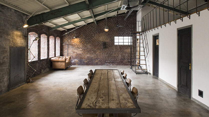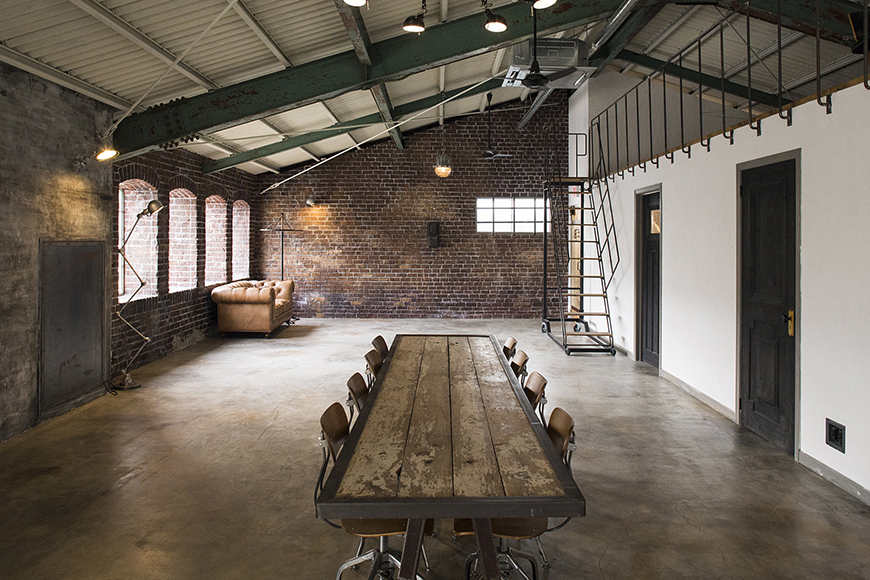 エイジング加工されたモルタル床に、赤レンガ、白レンガの壁、鉄骨剝き出しの屋根組みや柱、梁がインダストリアルな空間を創り出し、隠れ家のようなロフトスペースが遊び心をくすぐります。倉庫街の秘密の隠れ家をイメージしたというこのスタジオは、その通り細部までこだわりが見られ、男性が憧れるシチューエ―ションとなっています。