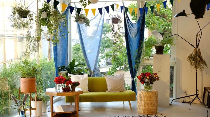 自然光が降り注ぎ、グリーンが多く風通しのいい空間になっています。スタジオ内には撮影に使える家具や小物、観葉植物が充実し、撮影のアクセントとして使用することができます。
