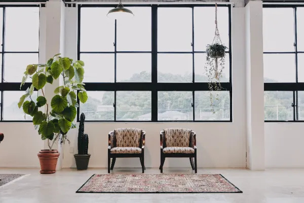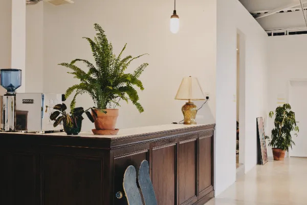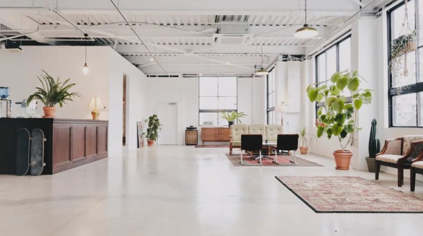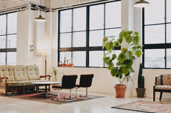 広さ100㎡の2Fスタジオは大きな窓から自然光が降り注ぐ開放的な空間が広がっており、木製のカウンターやソファなどセンスの良いインテリアが充実しています。ピンクの外壁とペパーミントグリーンの外階段を設置した外観が、より一層おしゃれなイメージを醸し出します。