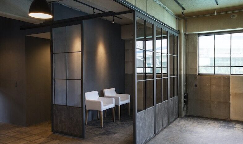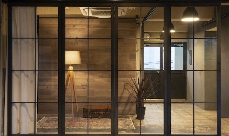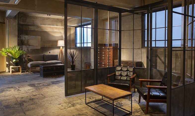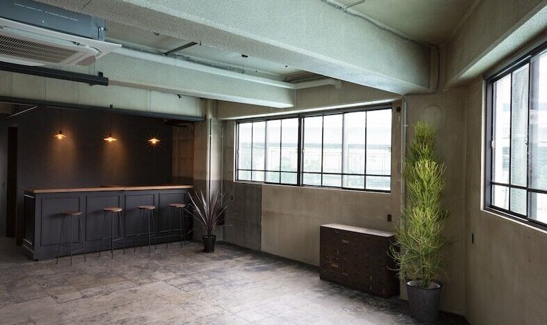 モルタル床やアイアン扉を活かした内装とともに、レトロな雰囲気の家具でコーディネートしたスタイリッシュな空間です。アイアン扉やカウンターは可動式のため、自在にレイアウト変更できます。