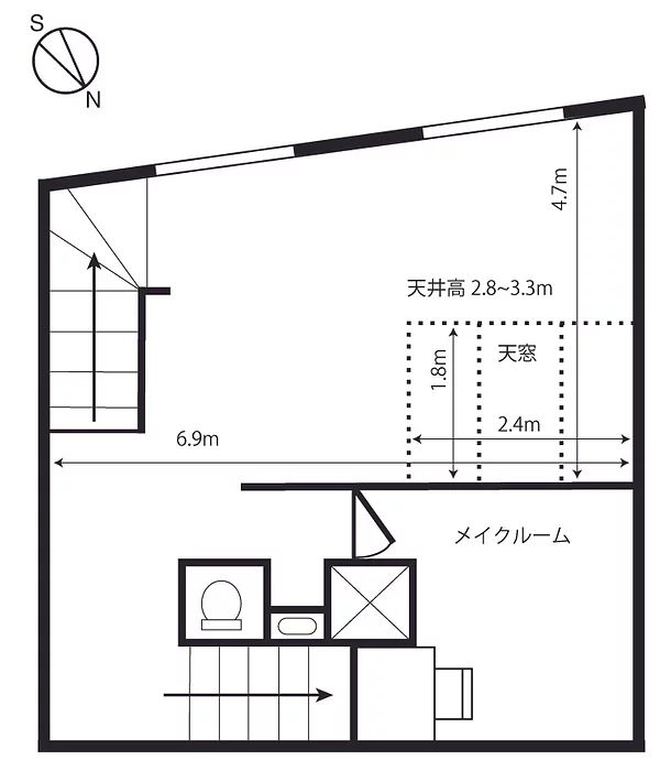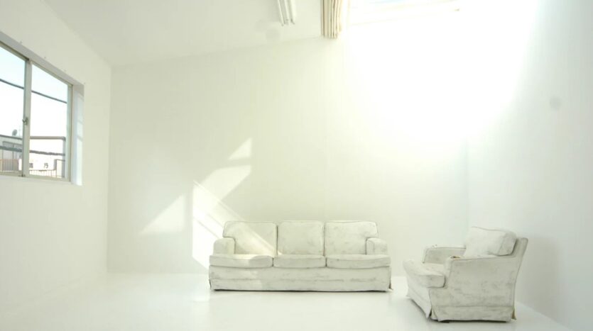 大きな天窓から自然光が豊富にはいり、日中はライティングなしでも撮影可能です。小ぶりながらも高い天井と白で統一された床と壁、白いソファが面積以上に広い空間を演出することができます。