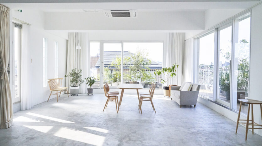 テラスに囲まれた空間は、モルタルの床に白壁を採用したシンプルな雰囲気となっています。テラスに面した2カ所の大開口部や高窓を設けているので、光が優しく回る明るさが魅力です。