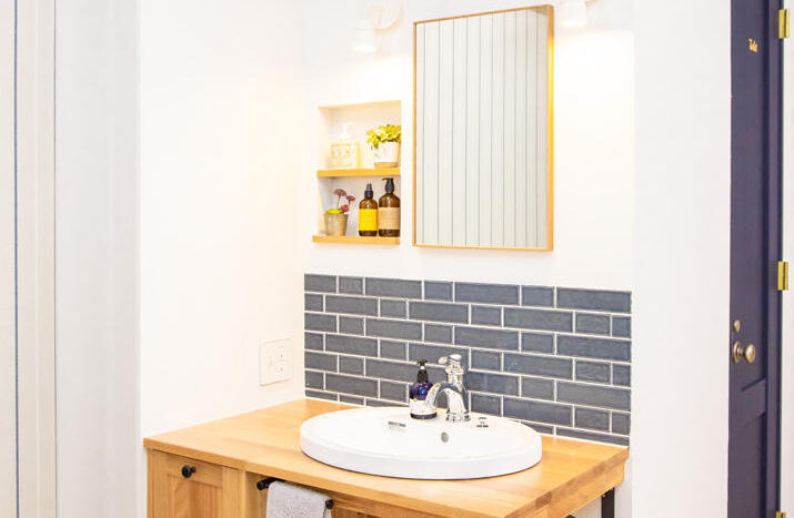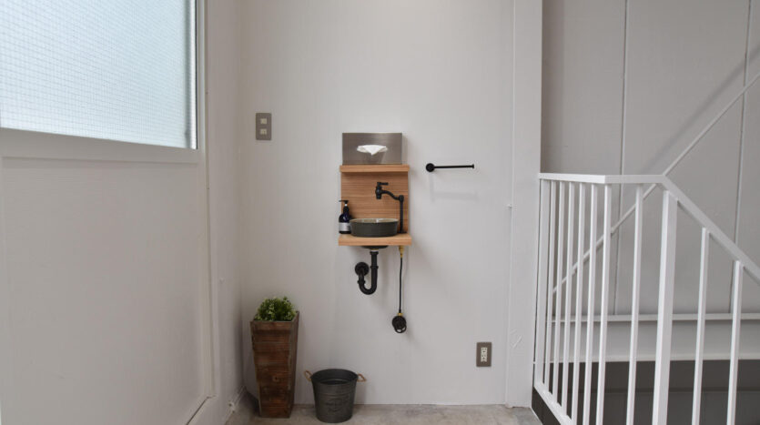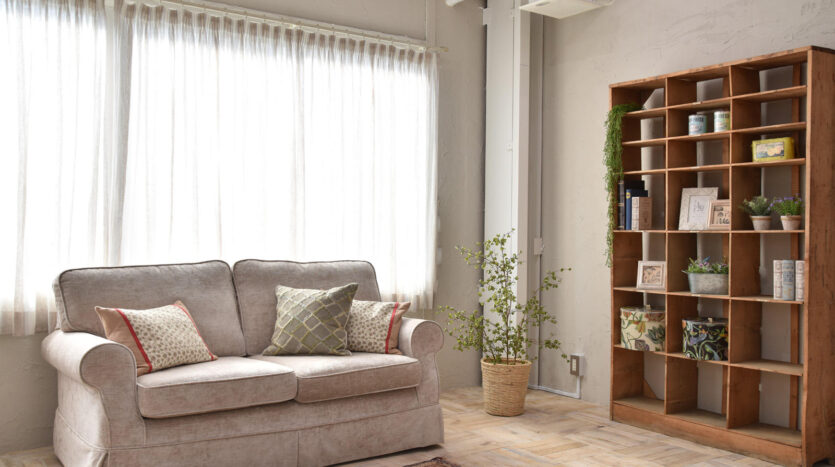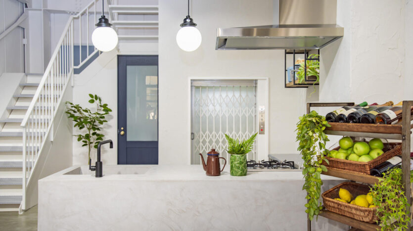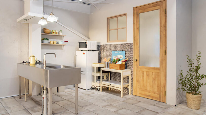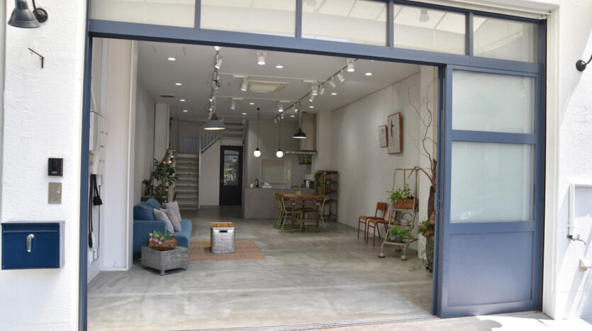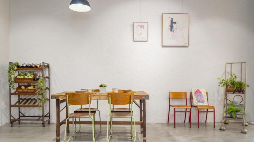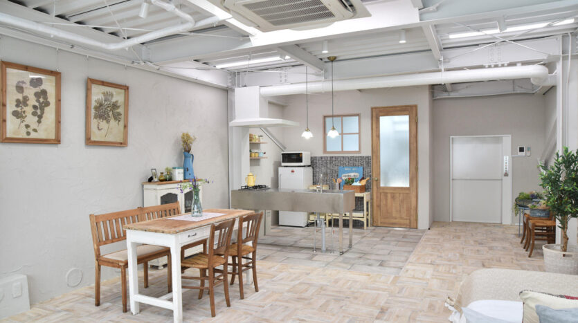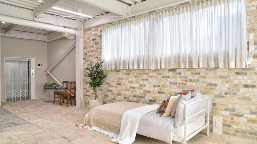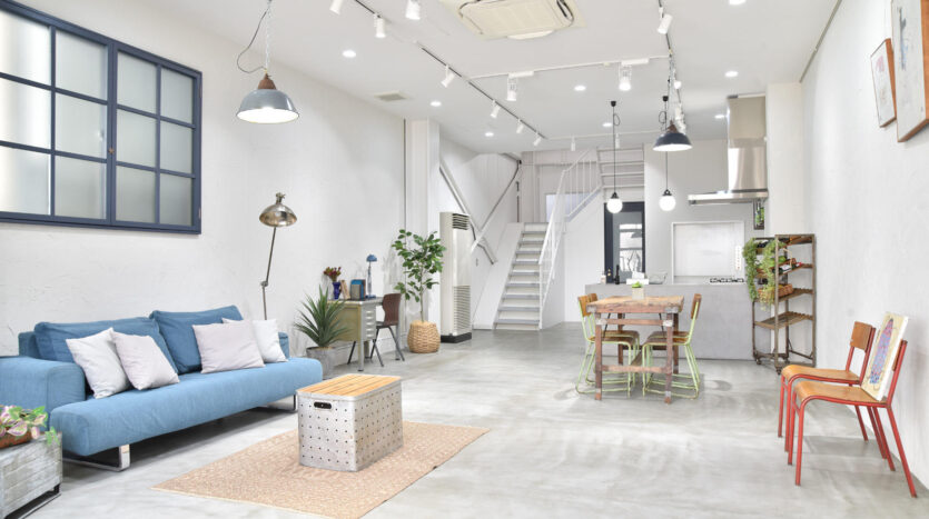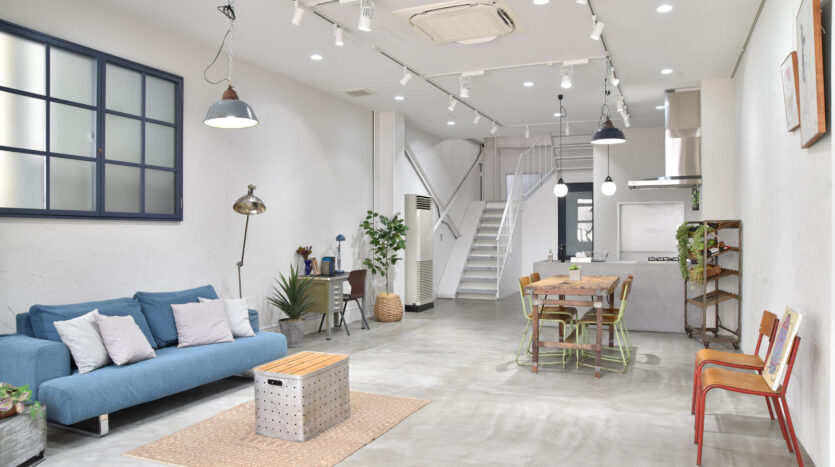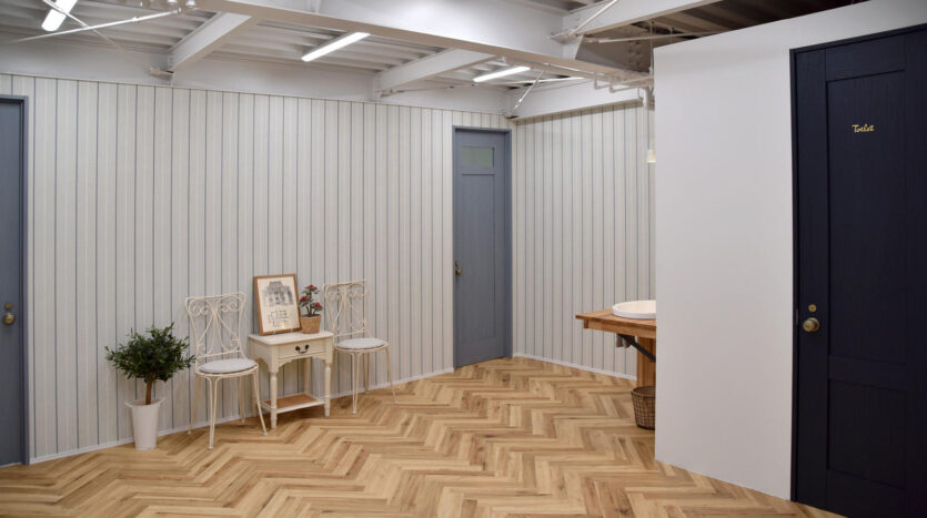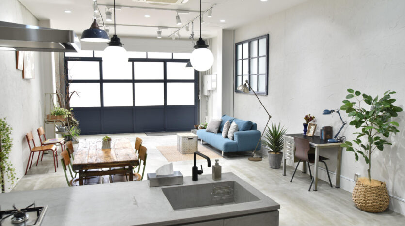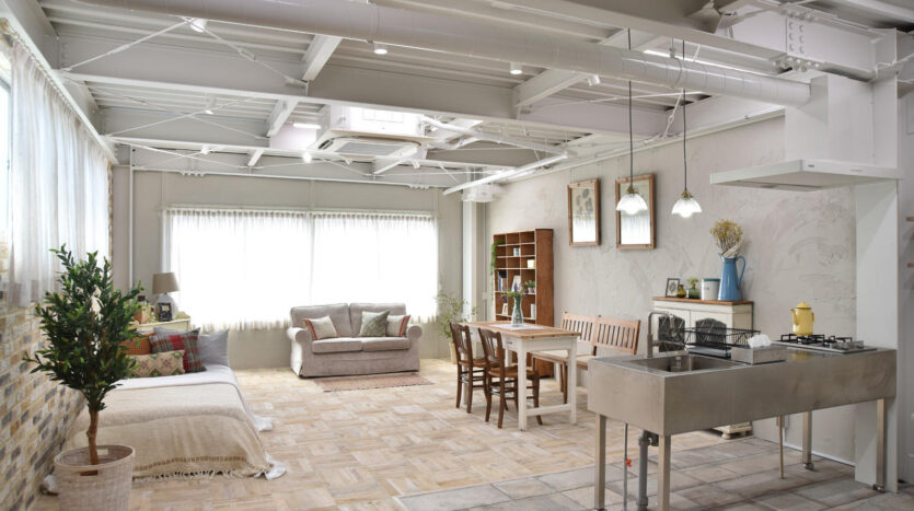 1階は、白壁にモルタル床を内装に用いて武骨でインダストリアルな雰囲気が特徴です。2階はブロカントの家具をセットしてフランスのお部屋をイメージした温かみのある空間となっています。3階は特注キッチンを設置し、ダイニングからリビング、ベッドをワンルームにセッティングしています。