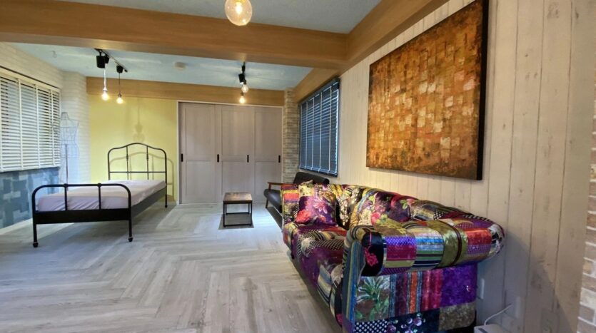 2階フロアは、ダークブラウンのフローリングにレンガ壁とヘリンボーン柄の壁を使い、ブルックリンテイストの仕上げ。30db台の防音対策が施され同録にも向いたスペースです。