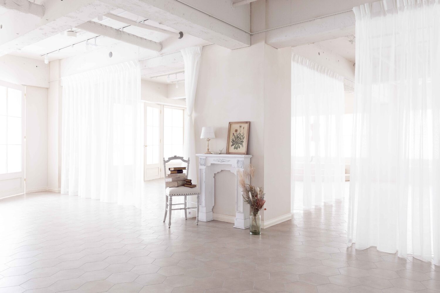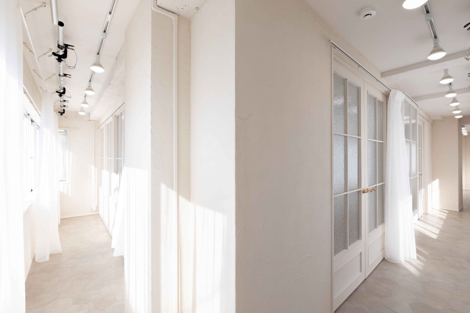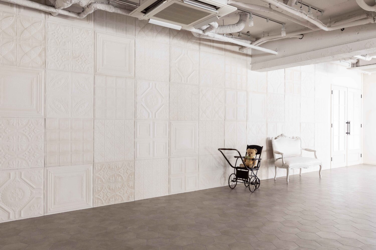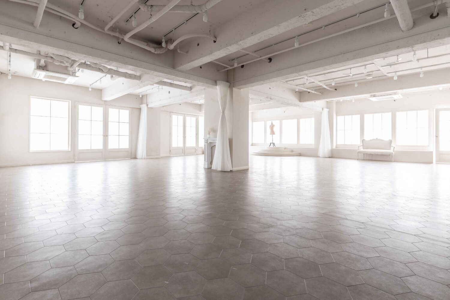 白を基調とし、自然光がたっぷりと入る天井高が3m、200㎡を超える広さのスタジオは、エイジング加工が施され、長年使い込んできたような質感がアンティークな印象を醸し出しています。全面に自然光が差込みL字型にスタジオを囲むサンルームは、窓裏ライティングができ、日差しの弱い天気、早朝や日没後でも天候に左右されずナチュラルな日差しが再現できます。また、幾何学模様を施したティンパネルの壁面や床一面のヘキサゴンタイルがアール・デコ調の雰囲気も演出します。