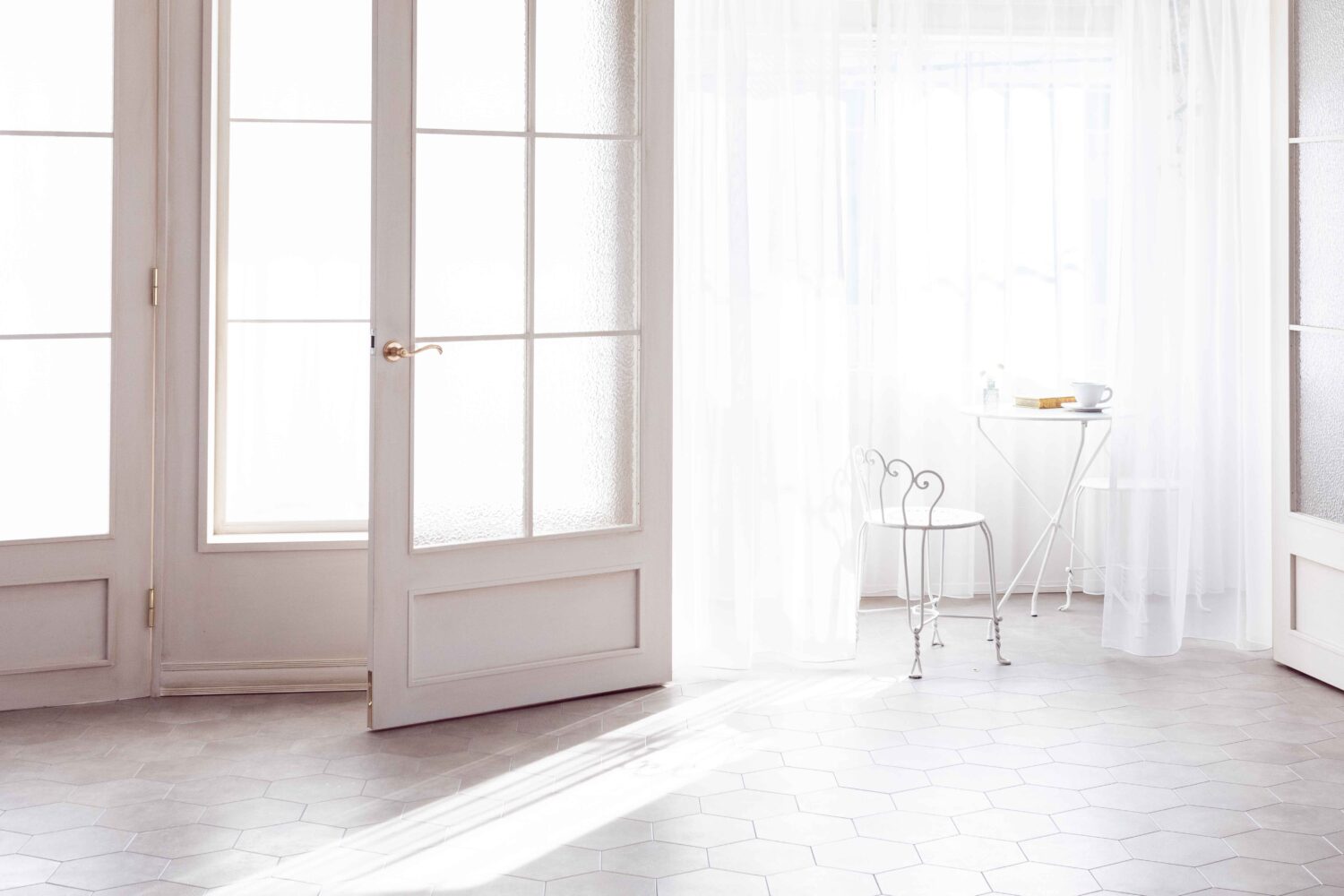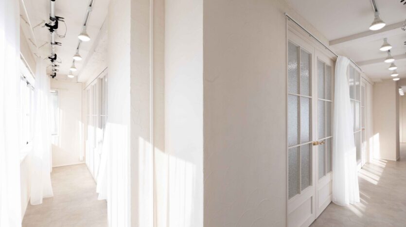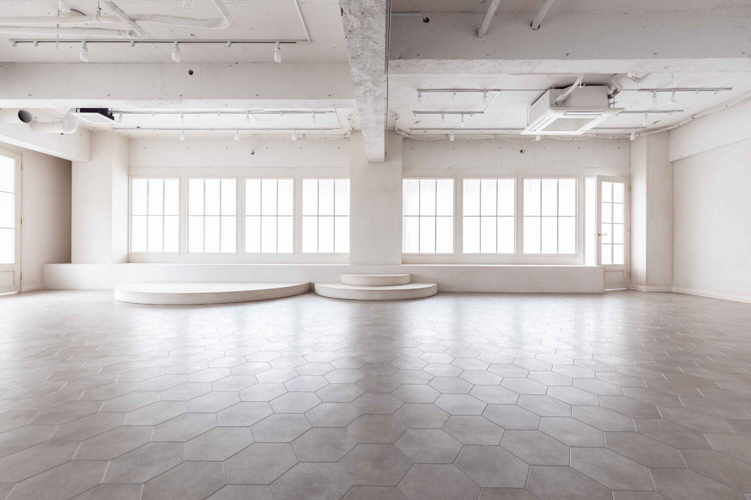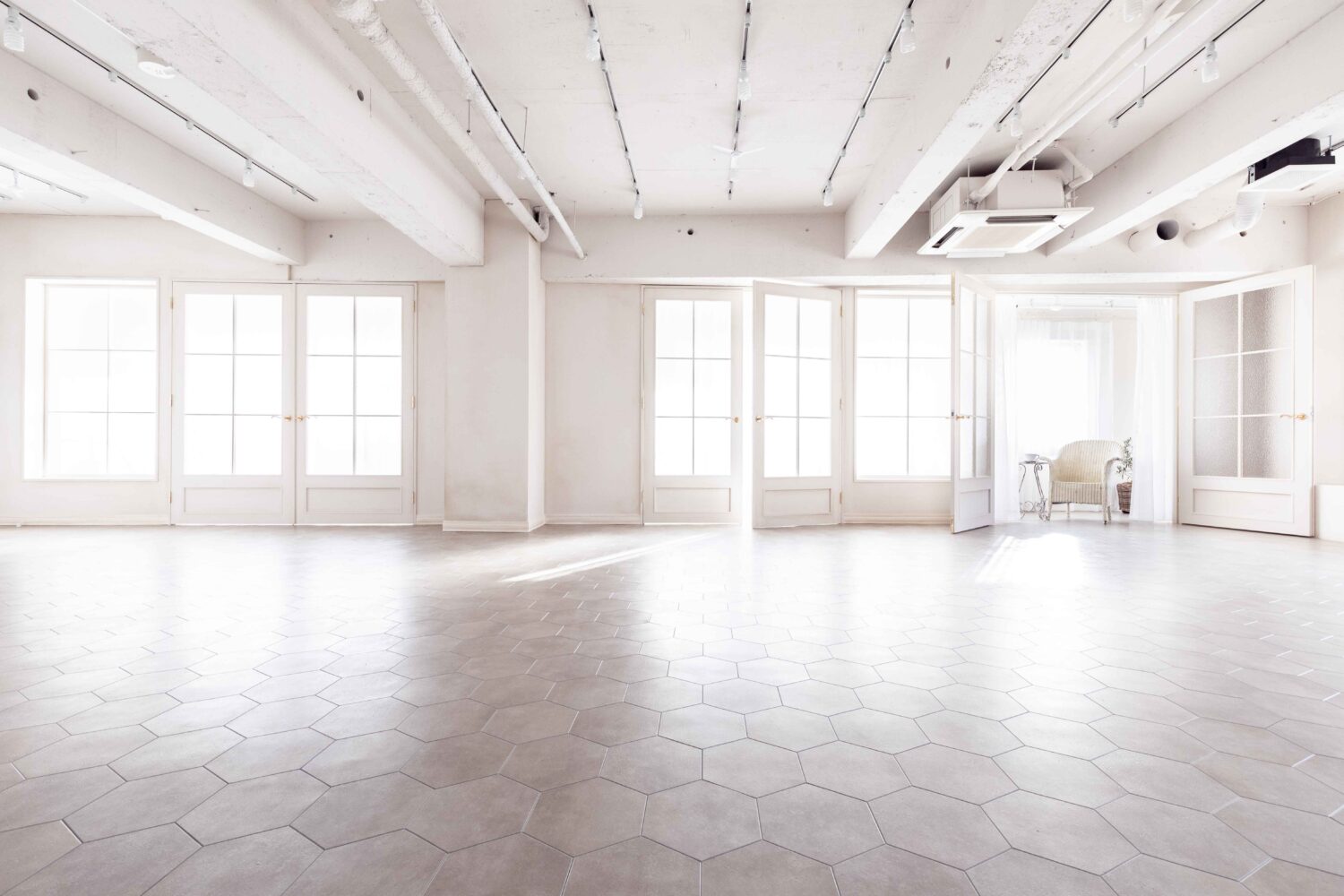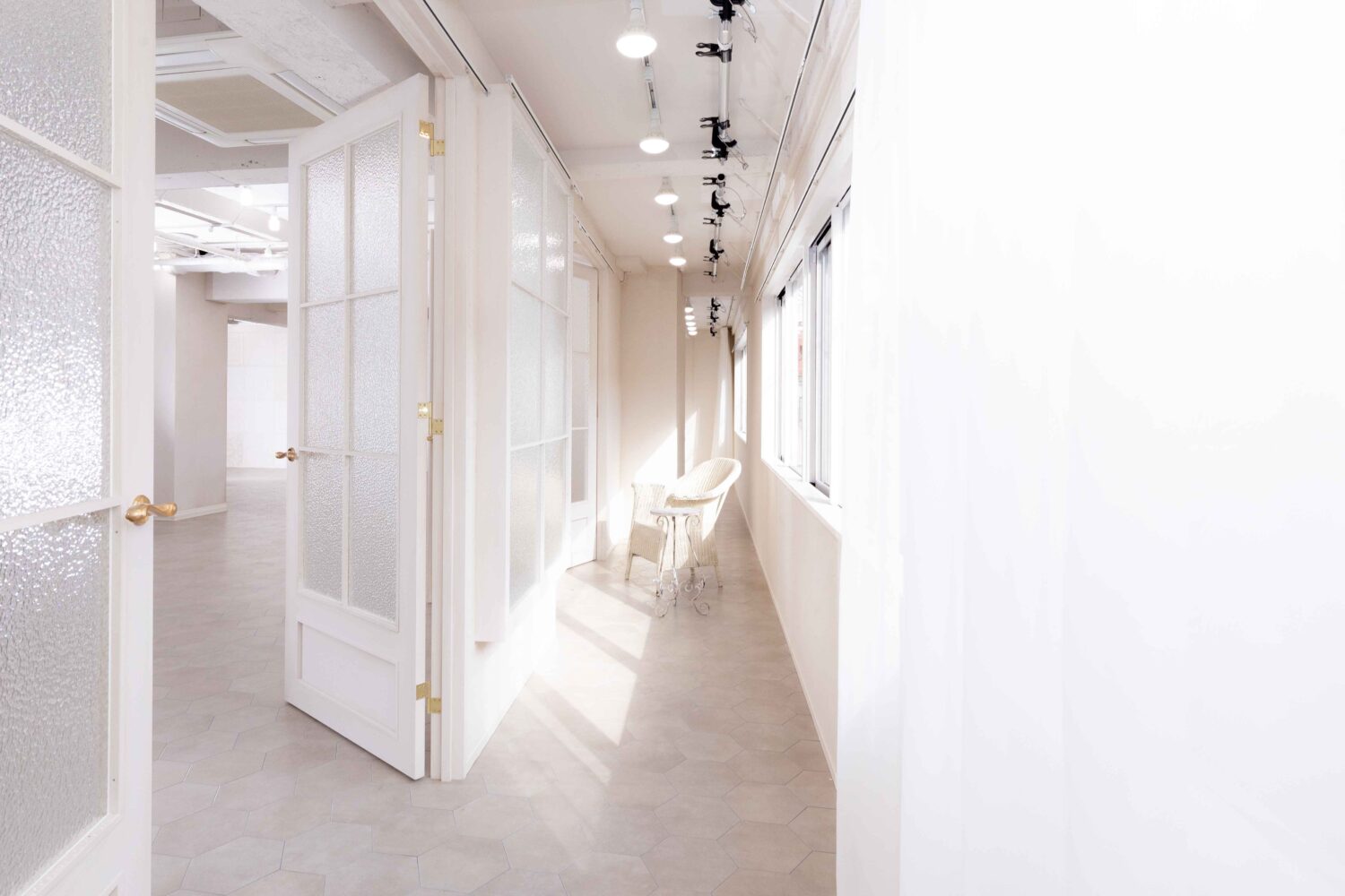 白を基調とし、自然光がたっぷりと入る天井高が3m、200㎡を超える広さのスタジオは、エイジング加工が施され、長年使い込んできたような質感がアンティークな印象を醸し出しています。全面に自然光が差込みL字型にスタジオを囲むサンルームは、窓裏ライティングができ、日差しの弱い天気、早朝や日没後でも天候に左右されずナチュラルな日差しが再現できます。また、幾何学模様を施したティンパネルの壁面や床一面のヘキサゴンタイルがアール・デコ調の雰囲気も演出します。