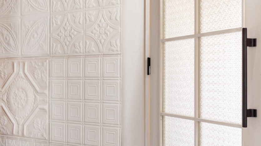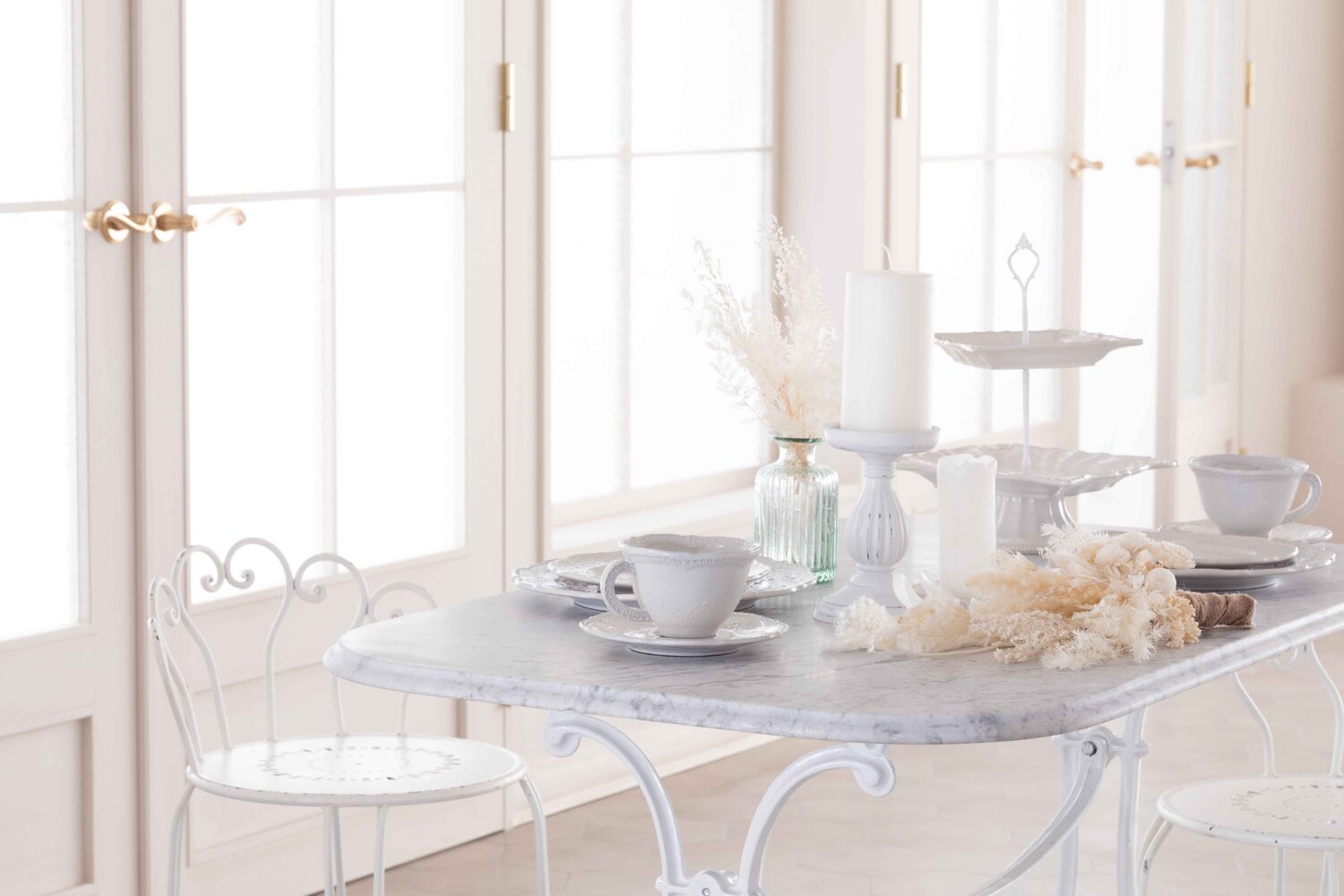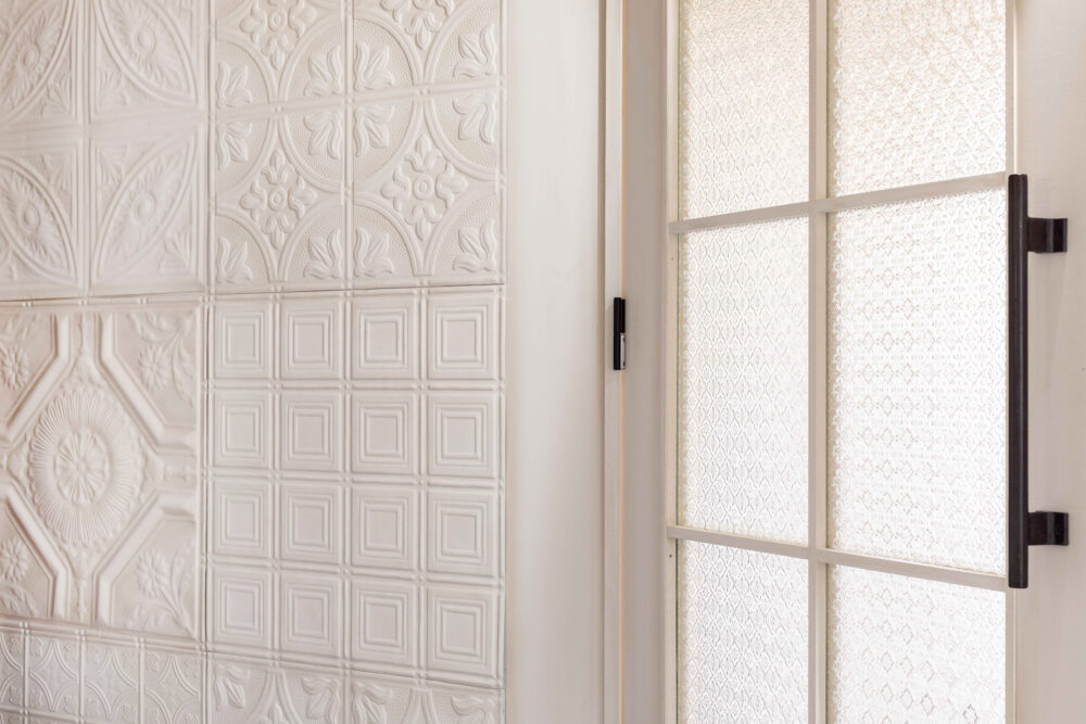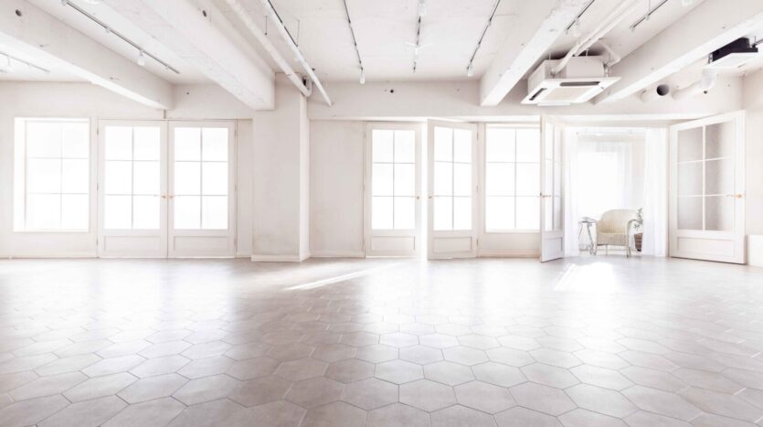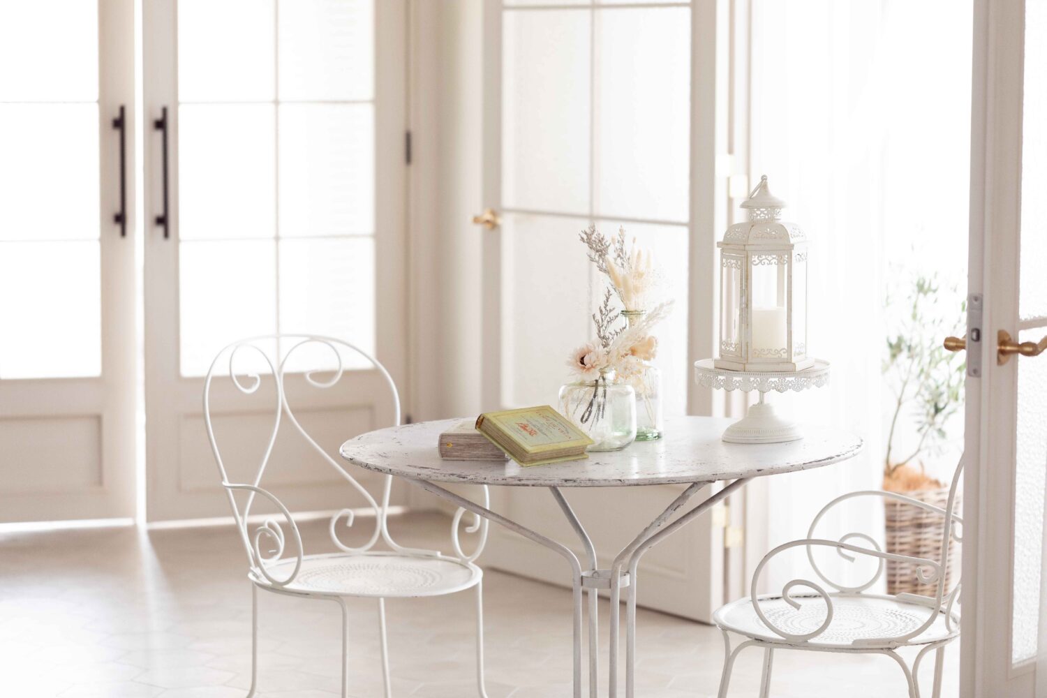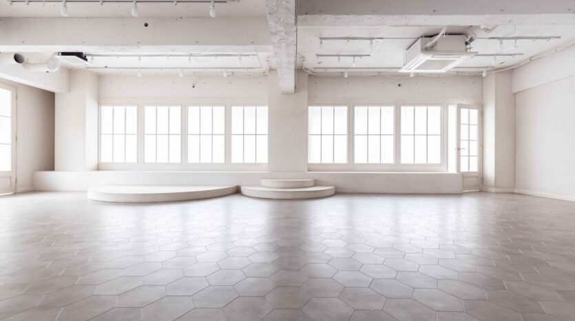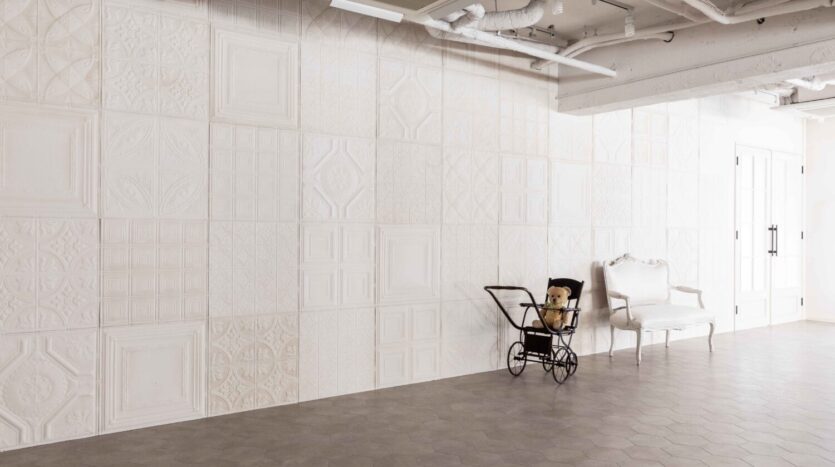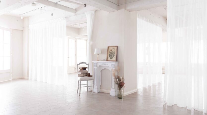 白を基調とし、自然光がたっぷりと入る天井高が3m、200㎡を超える広さのスタジオは、エイジング加工が施され、長年使い込んできたような質感がアンティークな印象を醸し出しています。全面に自然光が差込みL字型にスタジオを囲むサンルームは、窓裏ライティングができ、日差しの弱い天気、早朝や日没後でも天候に左右されずナチュラルな日差しが再現できます。また、幾何学模様を施したティンパネルの壁面や床一面のヘキサゴンタイルがアール・デコ調の雰囲気も演出します。