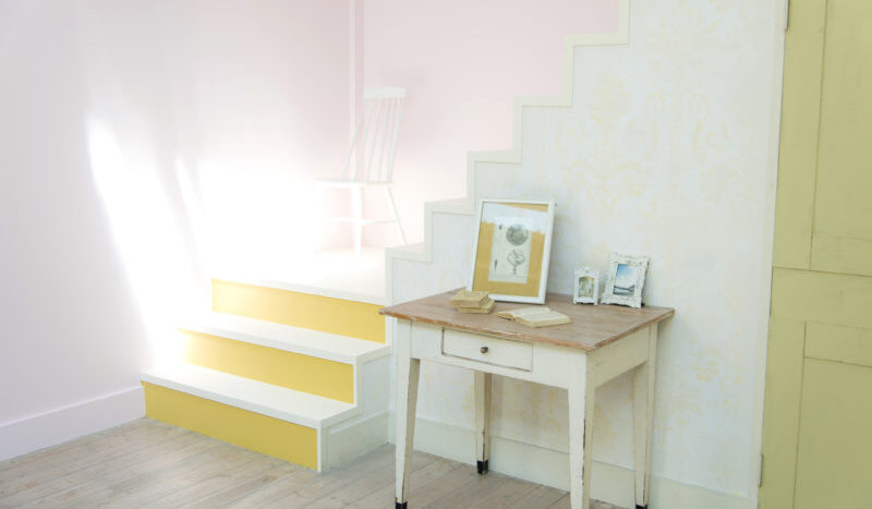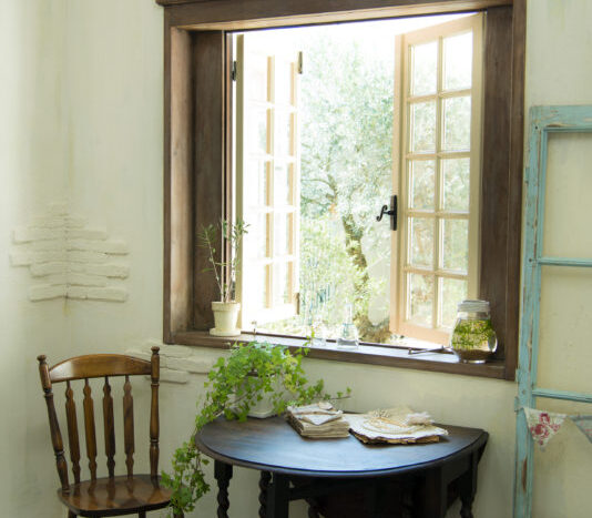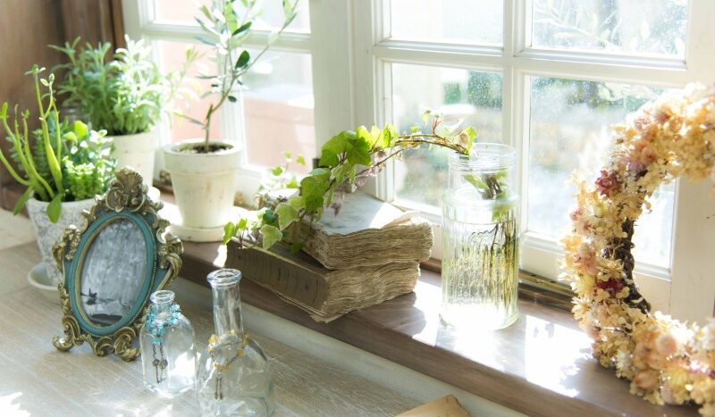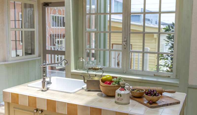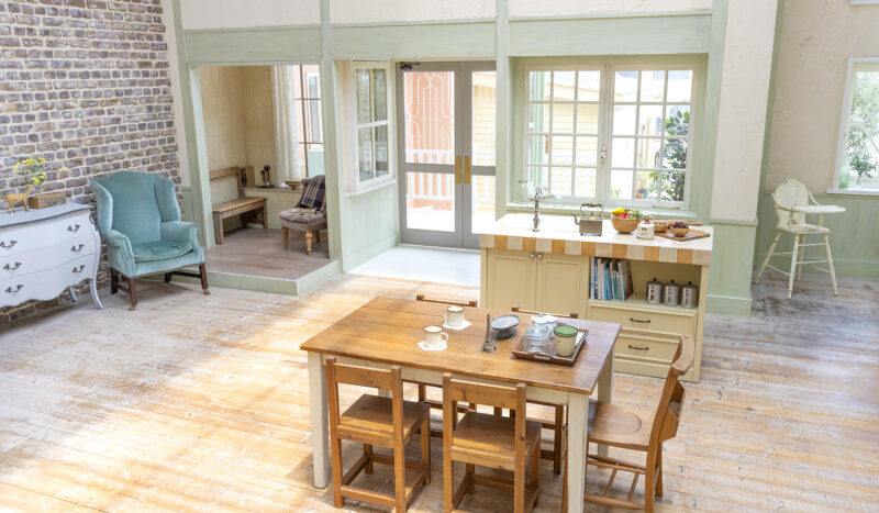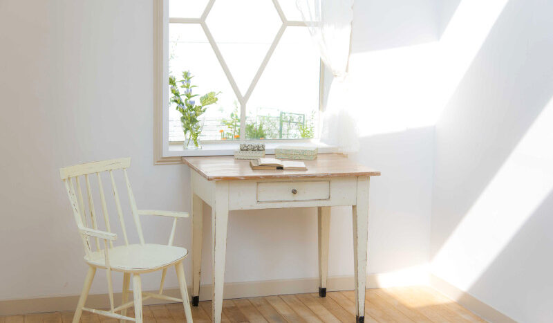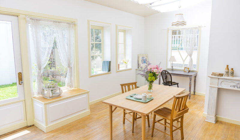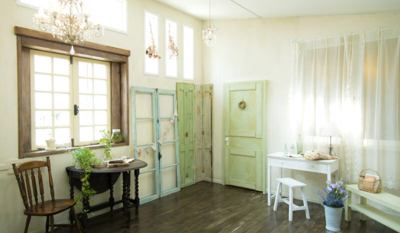 コクのある木目のフローリング床に、シャビーシックな色合いのドアの造作、小物などが特徴。窓も豊富にあるので、光がキラキラ差し込みます。