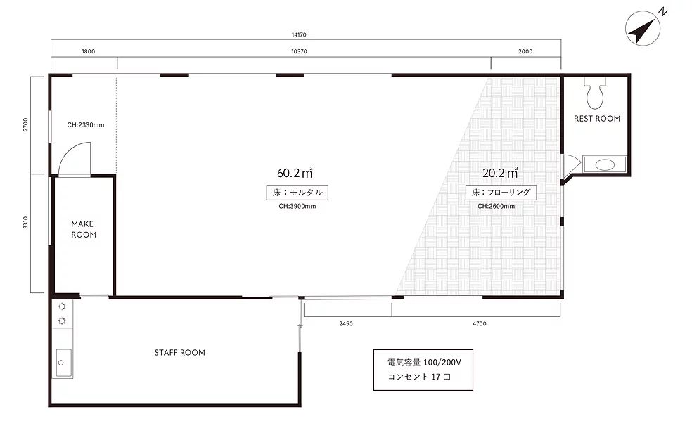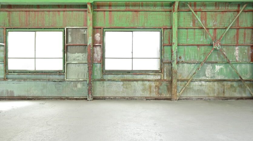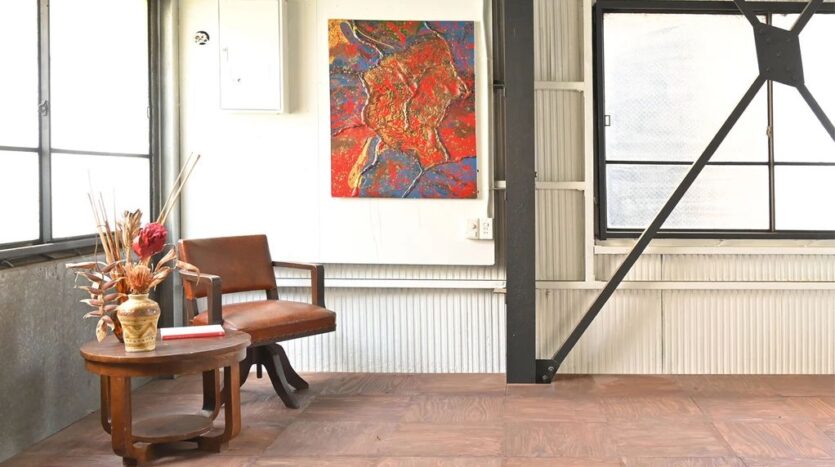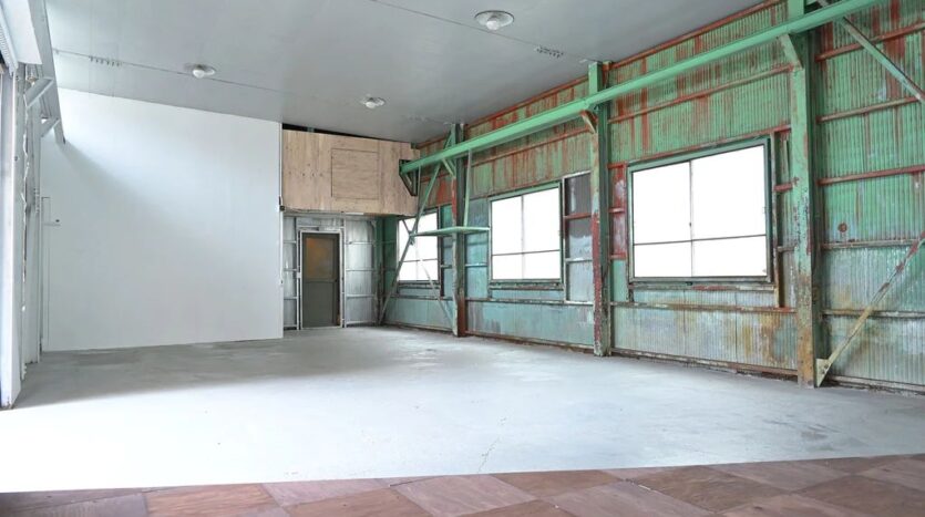 3面採光で自然光が日中をとおして降りそそぐ間口6m×奥行14m、天井高4mの開放的な空間は、モルタル床とフローリングに貼り分けられています。モルタル床の倉庫としてのシチュエーションはもちろん、フローリング床は、ヴィンテージなイメージとなっており、用意されているコンパスチェアやスタッキングチェア、ヴィンテージサイドテーブルなどのプロップを使って多彩なシチュエーション撮影が可能です。