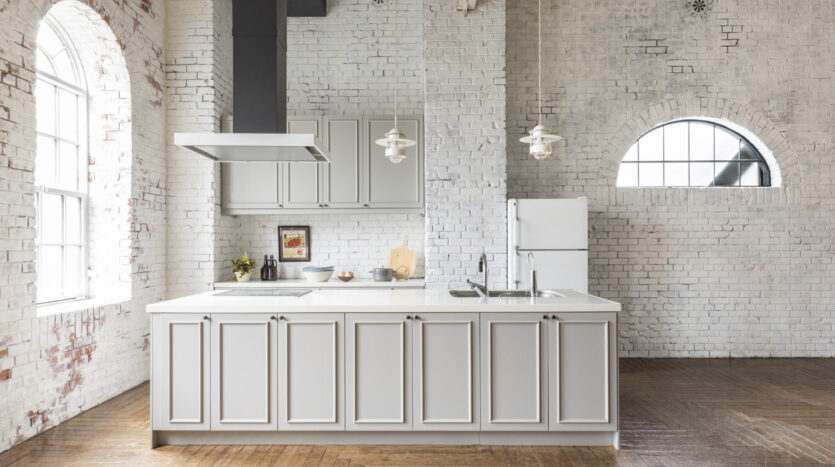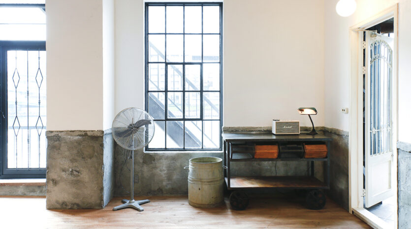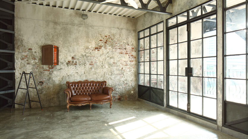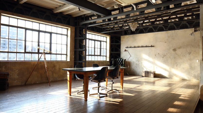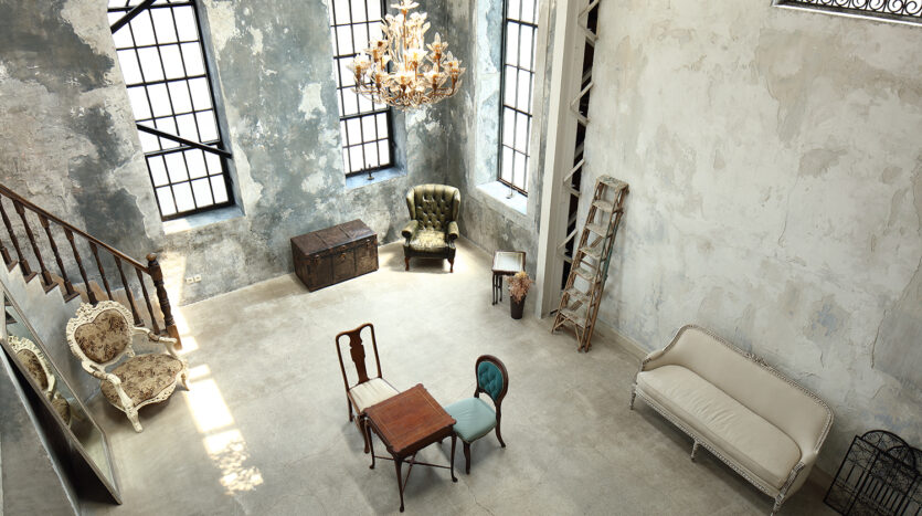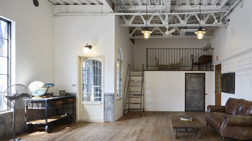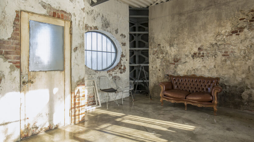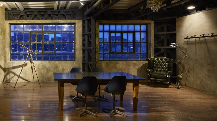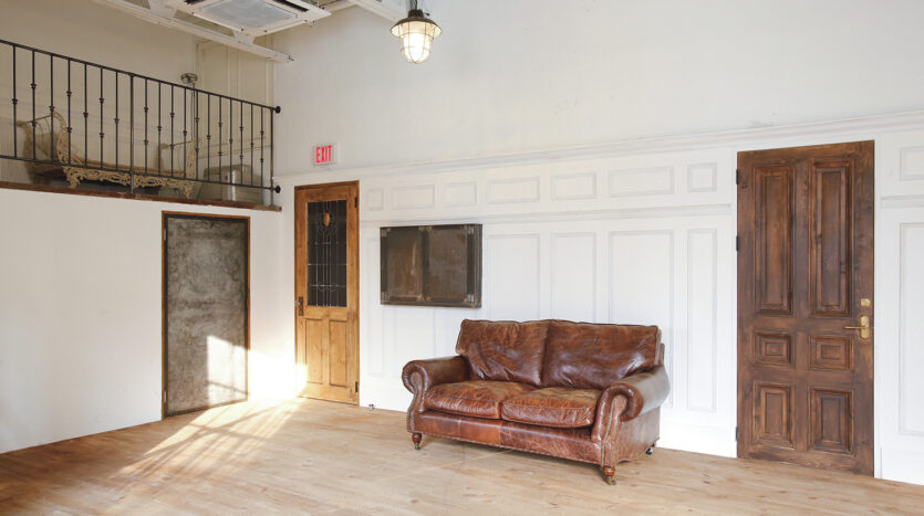 3階のスタジオ「レッフェル」は、鉄骨とコンクリートの床、無骨で色むらがあるレンガ壁、アイアン系の家具や革張りソファがハードでインダストリアルなイメージのスタジオです。