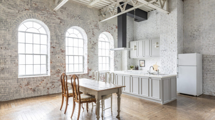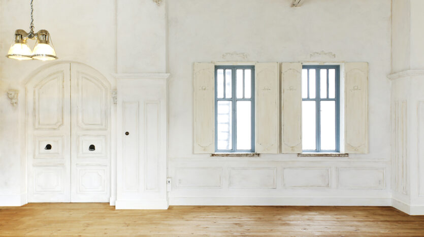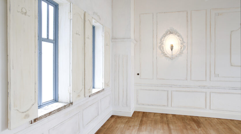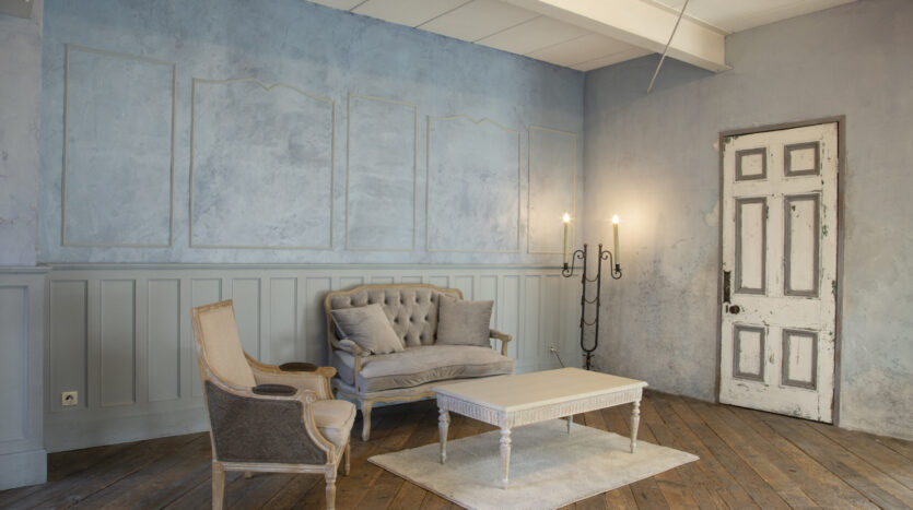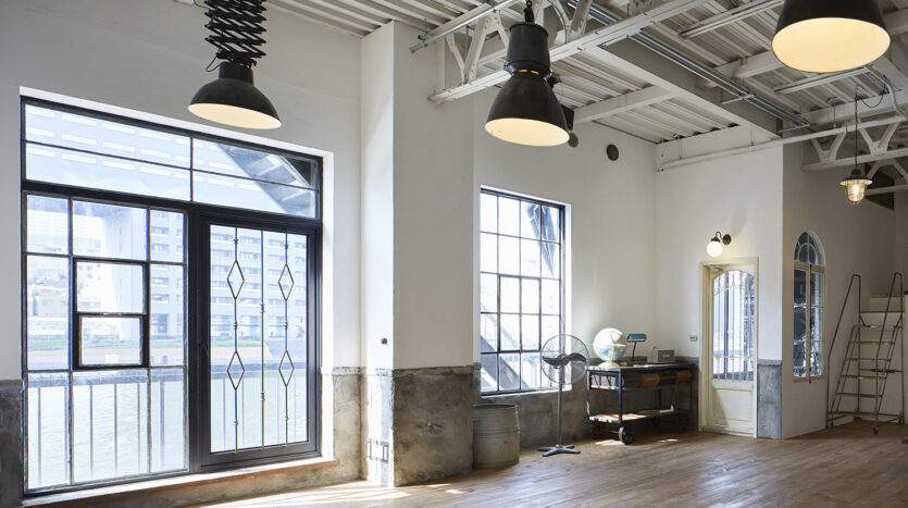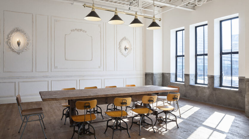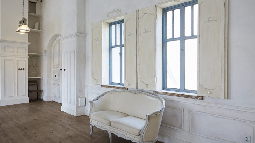 2階のスタジオ「セーヌ」は、ナチュラル色のフローリングとモールディングされた白壁にアンティークな家具がならびます。大きなアイランドキッチンで調理撮影も可能で、西側には隅田川が流れており、テラスから川抜けのシーンも撮影できます。