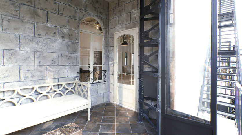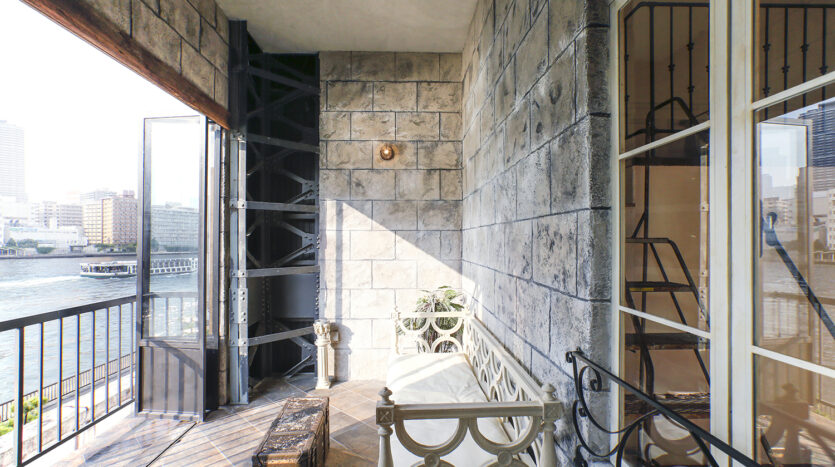 4-5階のスタジオ「フレミスマン」はヨーロッパの古城のイメージ。2階分の吹き抜けと大きな窓があり、たっぷりと光が降り注ぎます。また、石造りのテラスが魅力的です。
