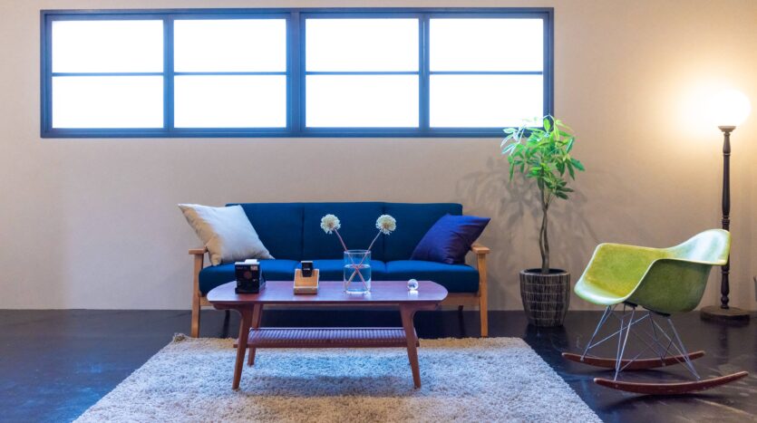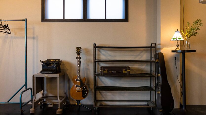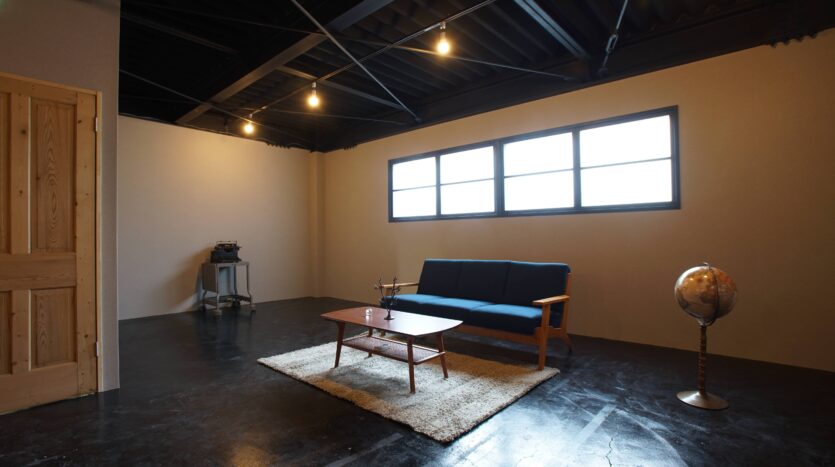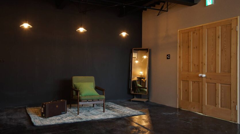 2階 Bスタジオは、黒い床に淡いベージュ色の壁、青い壁、黒く塗られた壁・天井と複数の背景が選べます。レトロな風合いの家具、ヴィンテージな小物が備えられ、シックで隠れ家的なイメージの内装に仕上げられています。