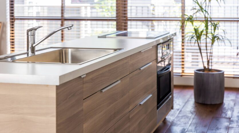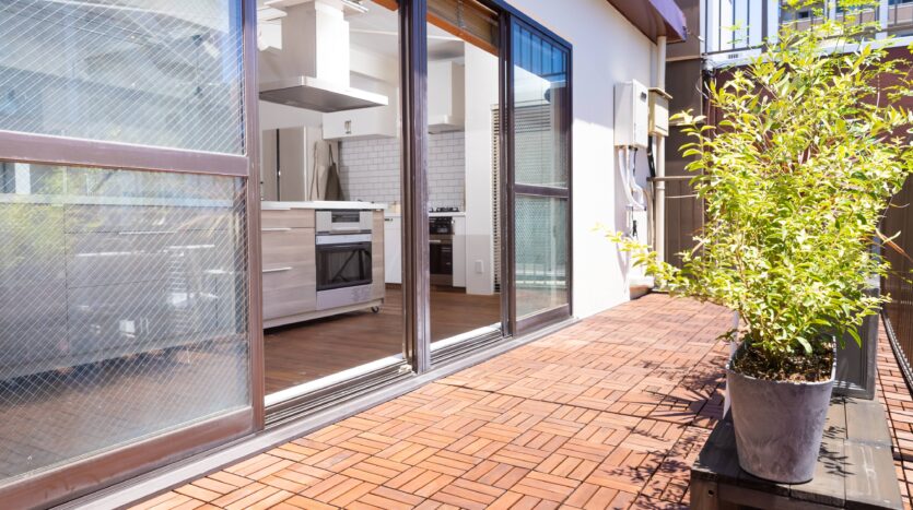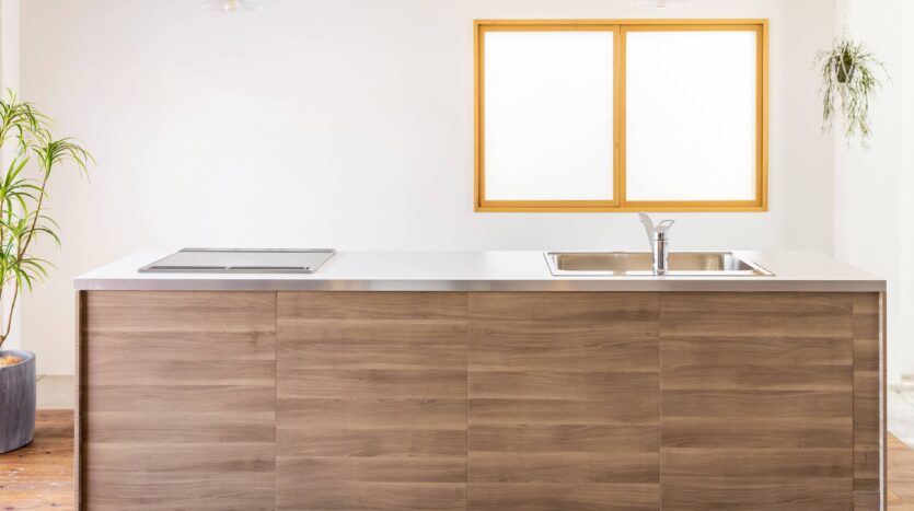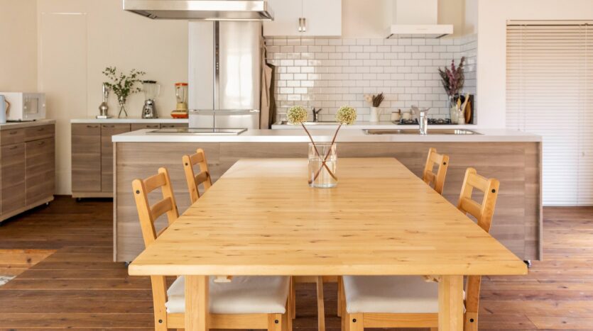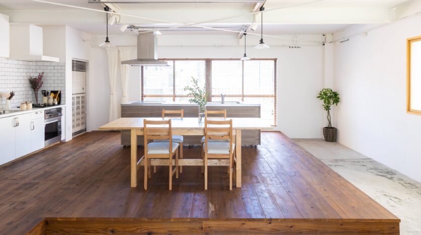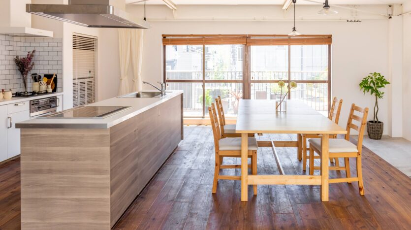 3階 Cスタジオは、大きな掃き出し窓からは自然光が溢れ、ナチュラルなイメージの空間。フローリング床とモルタル床に分けられ、フローリング部に置かれた可動式のアイランド型キッチンと据え付けの壁付けキッチンの二つのキッチンとダイニングテーブルはキッチンスタジオのような使い方ができます。