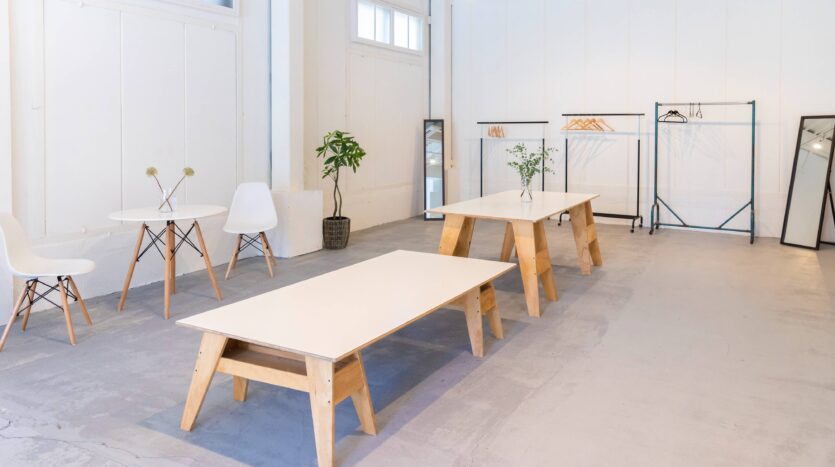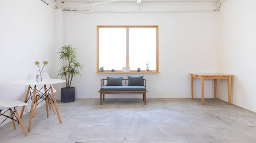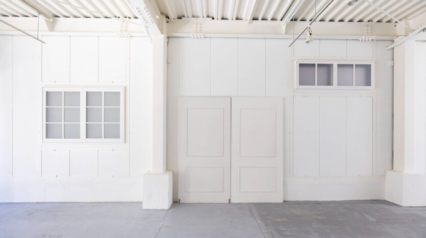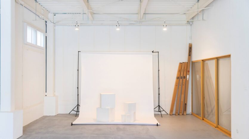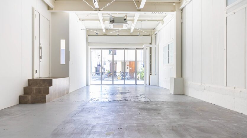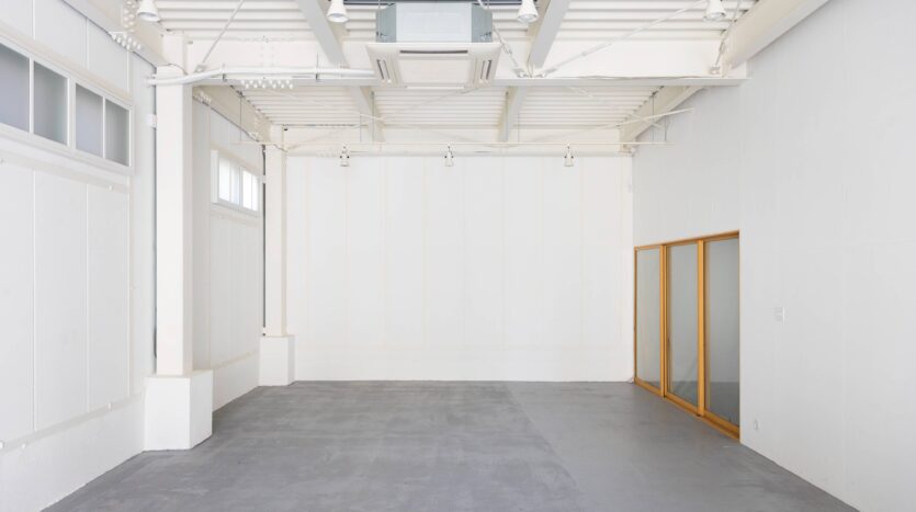 1階 Aスタジオは、モルタル床に白壁、3.8mの高さがある天井も白く塗られたインダストリアルなイメージのスタジオです。車両の乗り入れも可能なので、大型商品の撮影もできます。