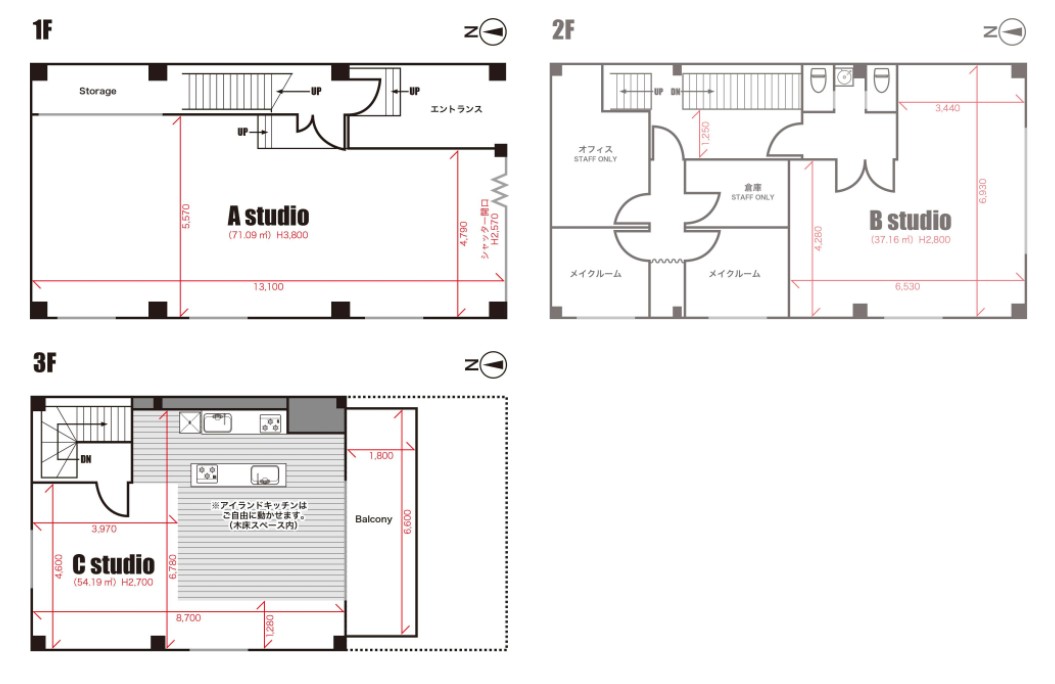 3階建てビル一棟が全てスタジオで、フロアごとにイメージの違ったスペースとなっています。