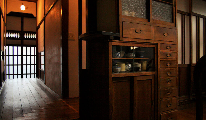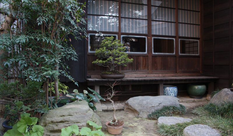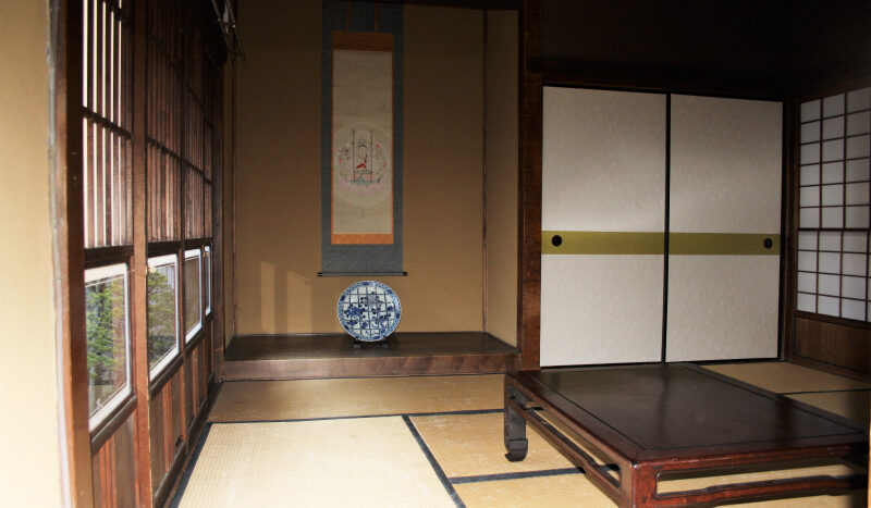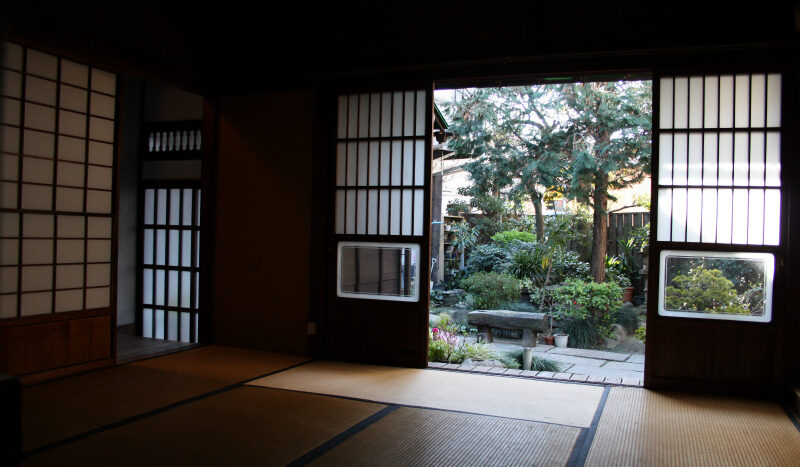 母屋は石畳のアプローチがある日本庭園に囲まれ、自然光豊かな南向きの縁側から庭が望めます。檜風呂や床の間付きの和室、二間続き和室、欄間や雪見障子などの造作は昭和初期そのものです。