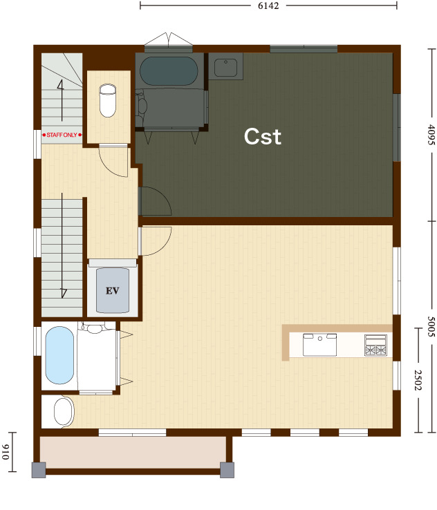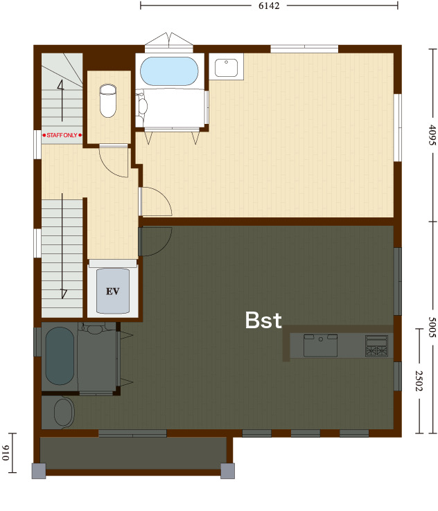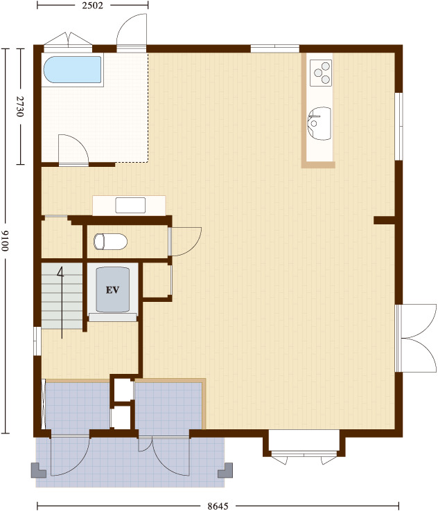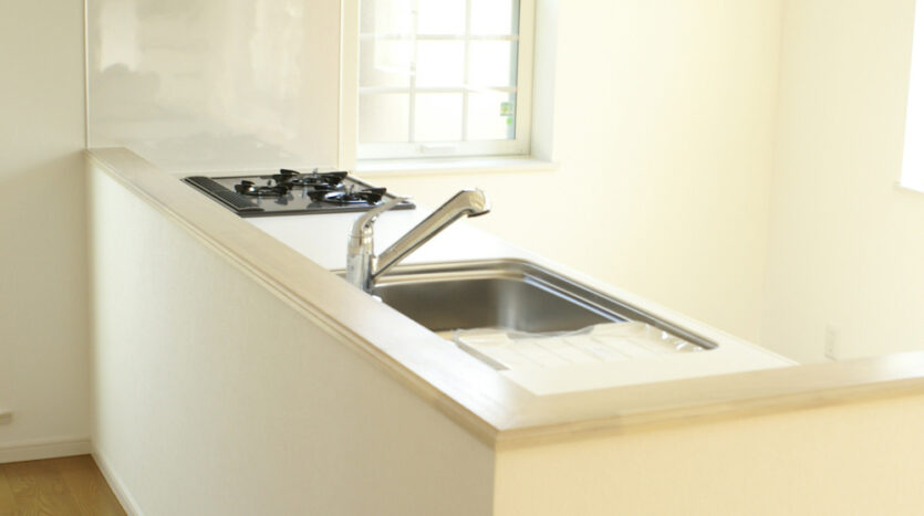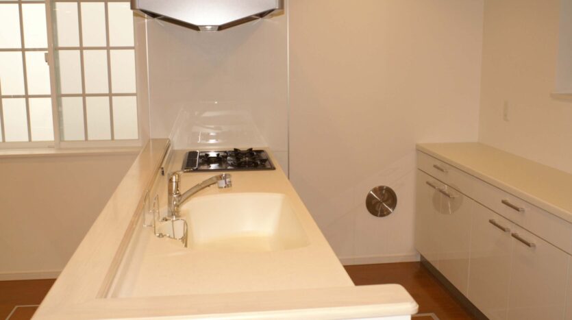 広さ20.6㎡、カウンターキッチンを設けたフローリング床の空間です。ユニットバスの開口部を広げるために、通常の出入り口以外に側面には外開きの折れ戸を設置しています。