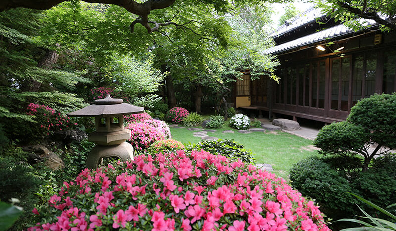 静かでゆったりとした時間が流れる木々の生い茂った庭園に囲まれた邸宅は、縁側にガラス越しにやわらかな自然光がそそぎます。書院造の和室に建て付けられた障子戸や玄関廻りの見事な格子戸などの内装品から調度品にいたるまで、まるでタイムスリップしたような空間です。石灯籠や手水鉢が置かれ、椿や梅、しだれ桜、ツツジ、紫陽花、紅葉など四季を感じることができる庭園は縁側から楽しむことができます。