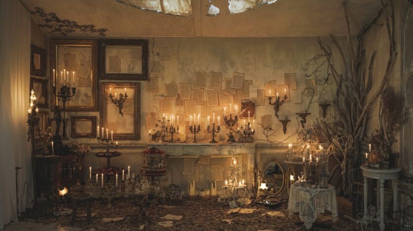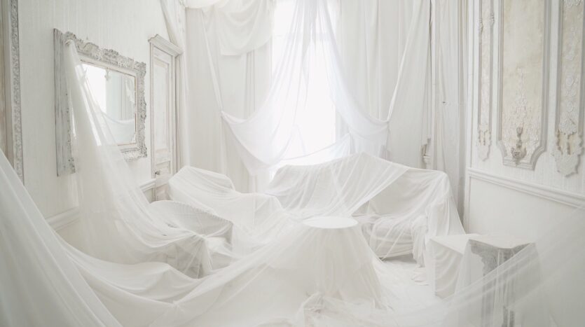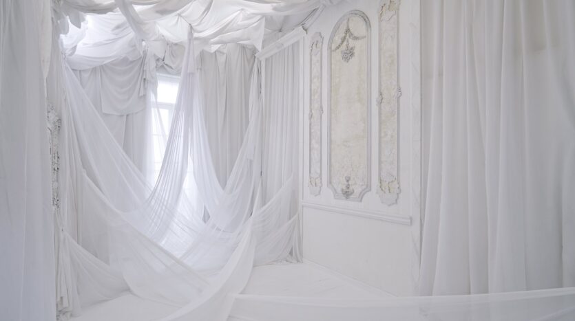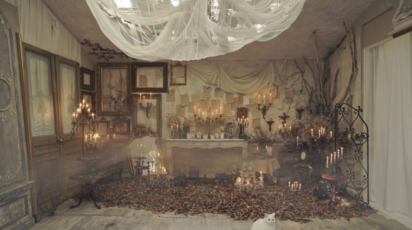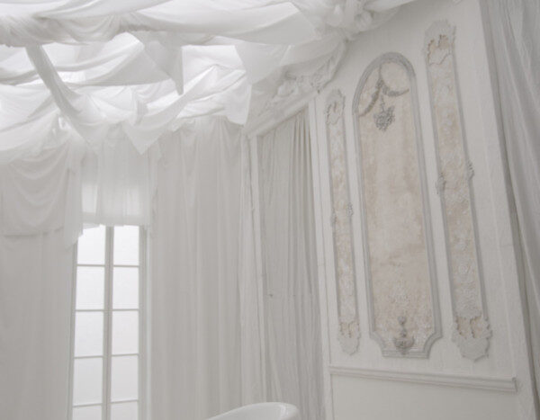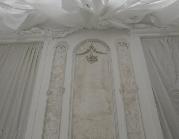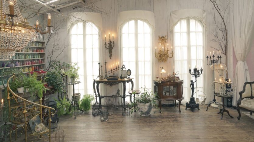 スタジオ内は4つの区画に分けられ、A区画はベージュメインの空間、B区画は布でほぼ覆い尽くされた全面天窓の白い布の区画、C区画はゴシック調のアンティークな区画、D区画は調度品が置かれたシャビーシックな区画と、それぞれが個性があります。