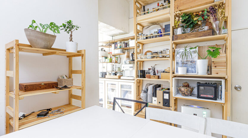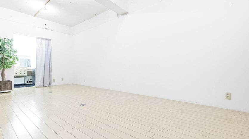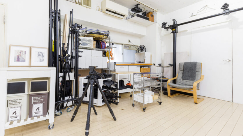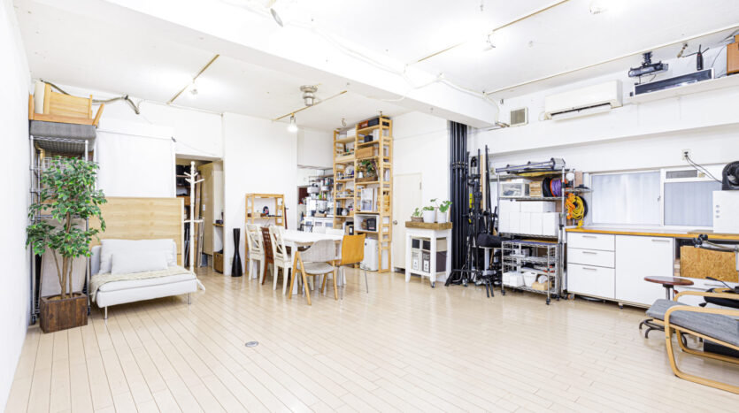 壁面は一面はセッティング無しで背景として使える白壁で、十分な天井の高さも確保しているため人物の全身撮影にも対応できます。スタジオ内の設備やインテリアの大半は移動できるようになっていて、好みのレイアウトに変更しやすいのもポイントです。