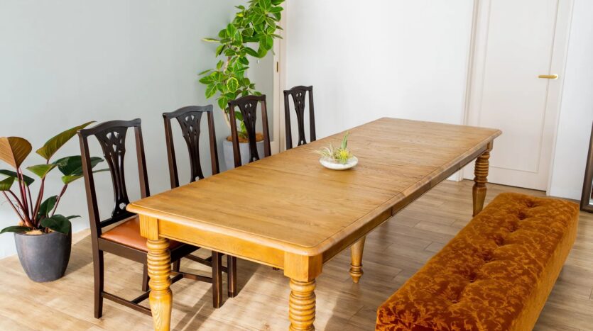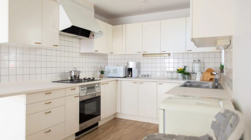 1階29畳のリビングダイニングは南側の約30坪の庭に面したテラスから自然光があふれ、淡いカラーのフローリングにホワイトクロスの壁と天井で明るく広々としたスペース。ダークブラウン系のソファセットとダイニングチェアがアクセントとなり、背景を引き締めます。キッチンスペースは、U型のホワイト色のシステムキッチンを取り入れ作業性が高く、清潔感があります。