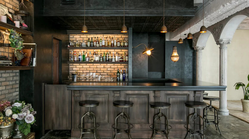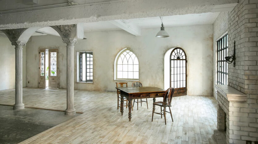 いくつも設置された窓には、国も年代もそれぞれ異なる窓枠を使っているのもポイント。中世ヨーロッパをイメージした暖炉やランプ、ブルックリンスタイルを彷彿とさせるカウンターバーなども設置し、ドラマチックなイメージを演出しています。