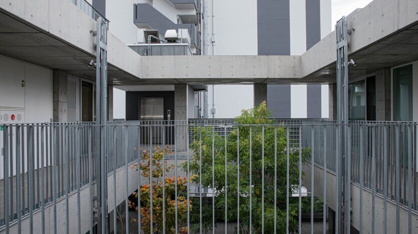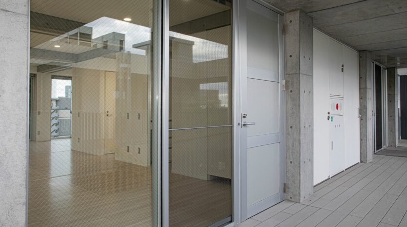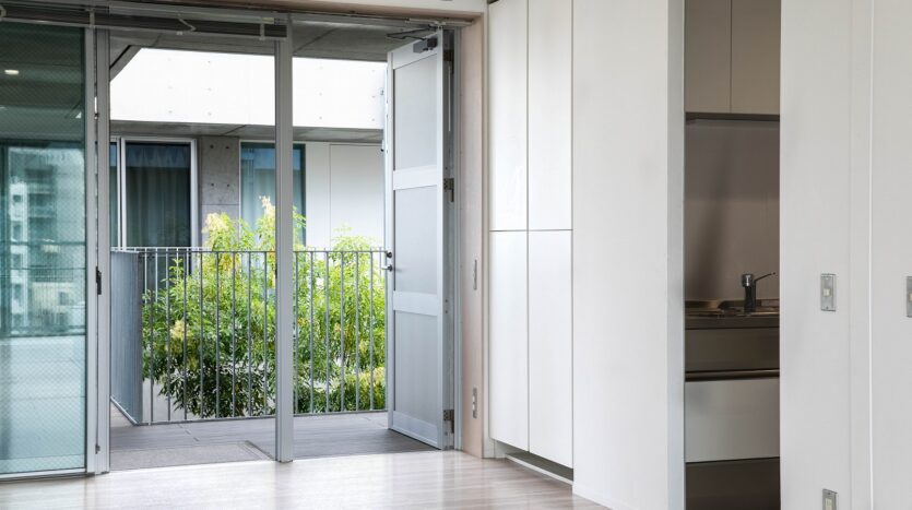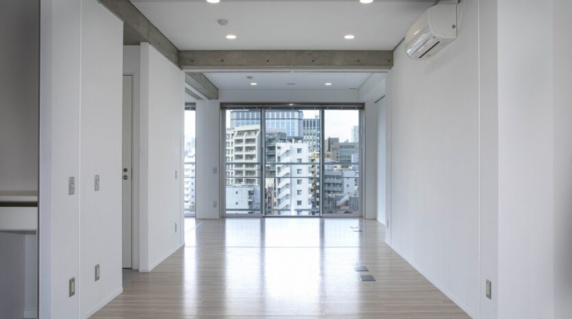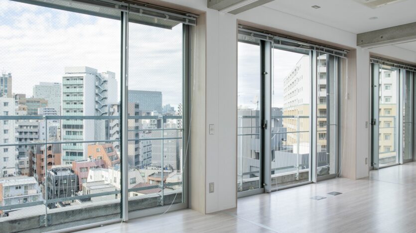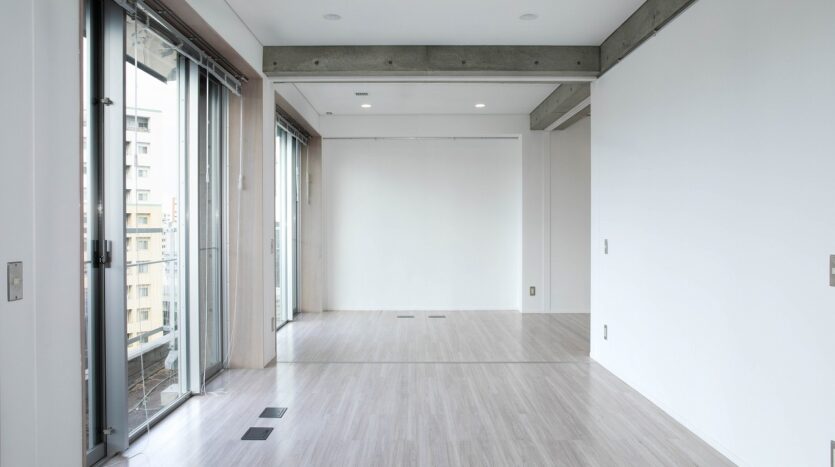 100㎡の広々空間に開口部を多数設けており、明るさと開放感が魅力の空間。白壁にフローリングのシンプルな内装なので、家具などを設置すれば住居やオフィスシーンにも利用できます。
