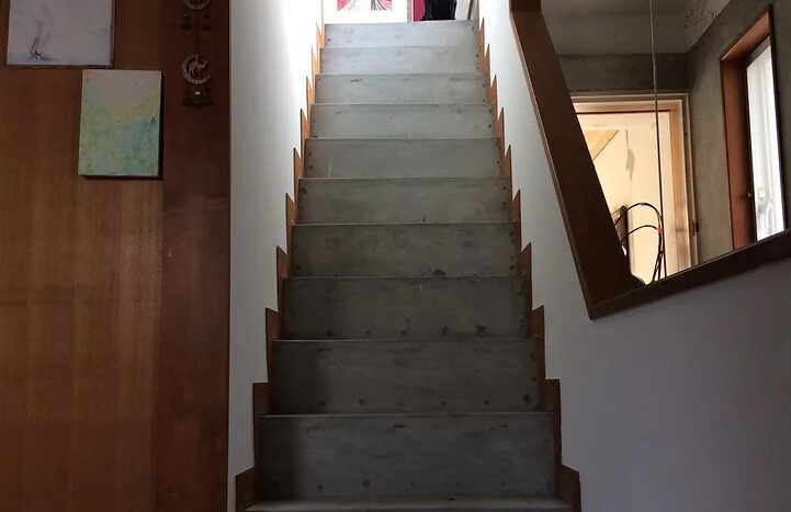 ステンレス製のアイランドキッチンを設置したキッチンスペースは、段差を設けたスキップフロアで壁面はアクセントクロスでおしゃれな雰囲気。リビングや階段、バスルームなどの壁面も、コンクリート打ちっぱなしでクールな印象を表現しています。