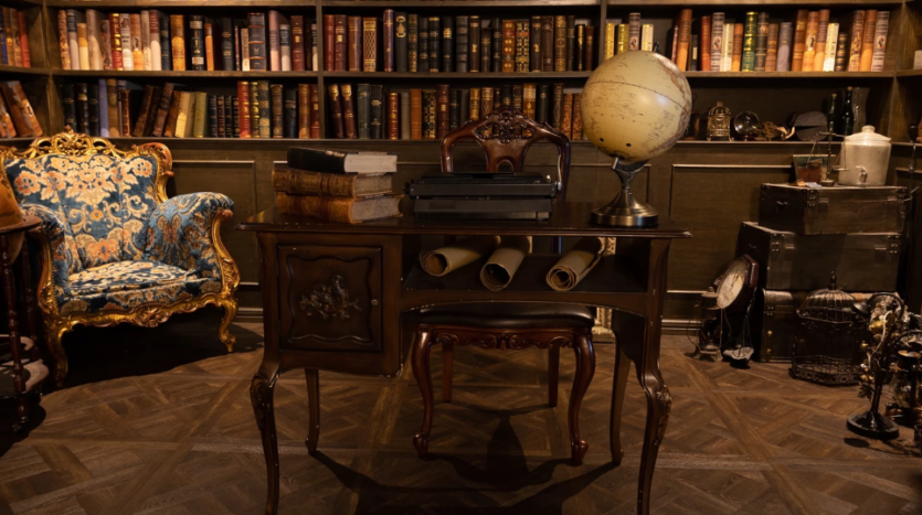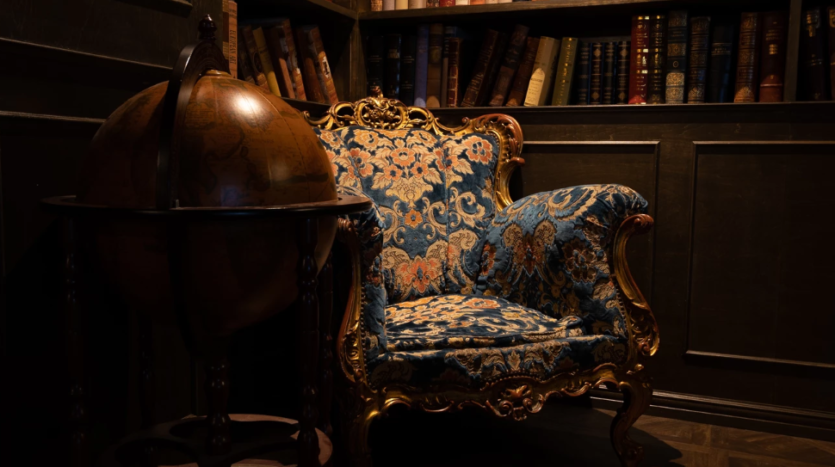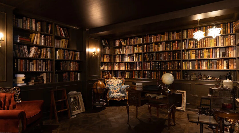 本がずらりと並んだ書庫エリアは、クラシカルな家具や調度品などでコーディネートされた落ち着いた空間で、間接照明を活かしたライティングが個性的な印象を放っています。