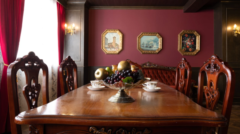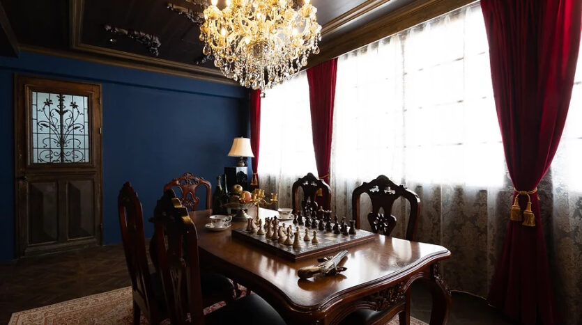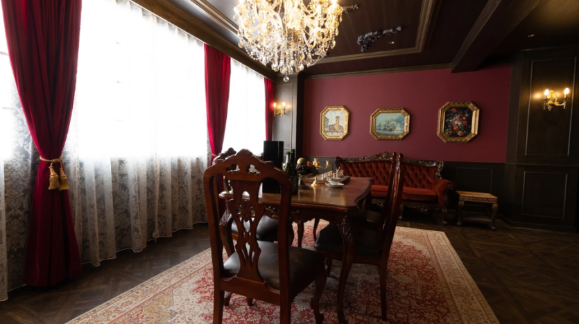 アンティークエリアは窓から自然光が差し込む空間で、きらびやかなシャンデリアがテーブルを照らす華やかな演出が特徴です。