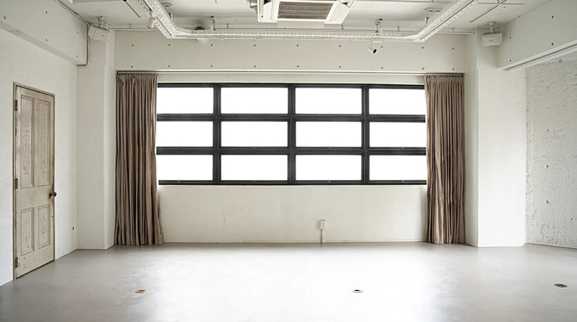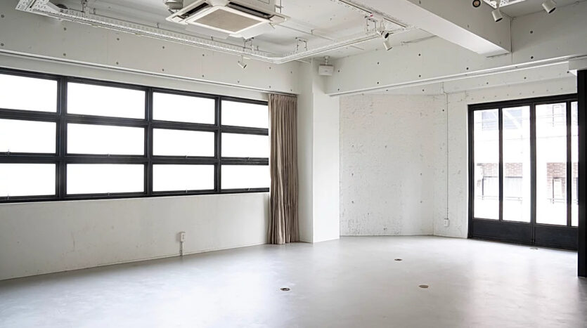 2Fがスタジオスペースで、モルタル床とスケルトン天井というシンプル設計に黒のアイアン窓枠が映える空間です。2面採光なのできれいに日差しが差し込み、自然光で撮影することができます。