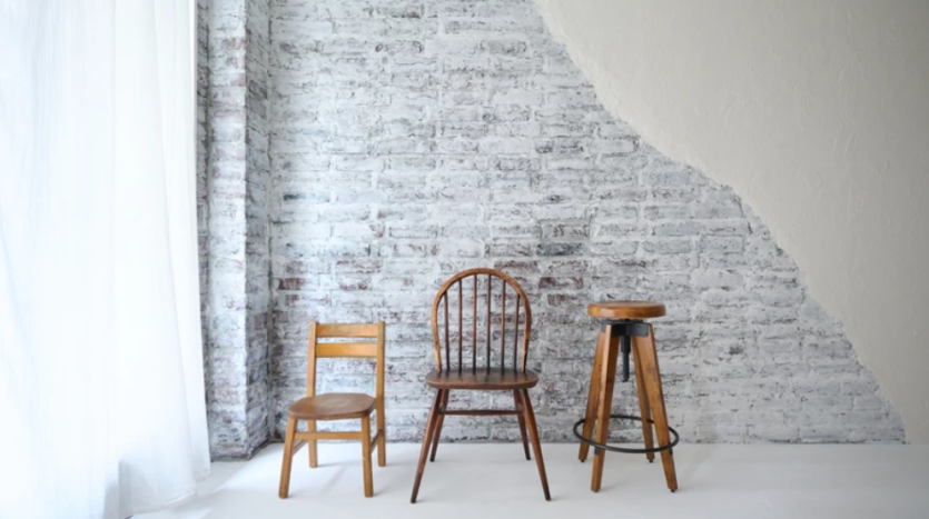 スタジオ内は白とグレーを基調にしたシンプルな内装で、大きな窓から自然光が差し込む明るい空間です。インダストリアルテイストの家具やアンティーク小物などの家具や小道具は無料で利用でき、落ち着いた雰囲気の演出に役立ちます。
