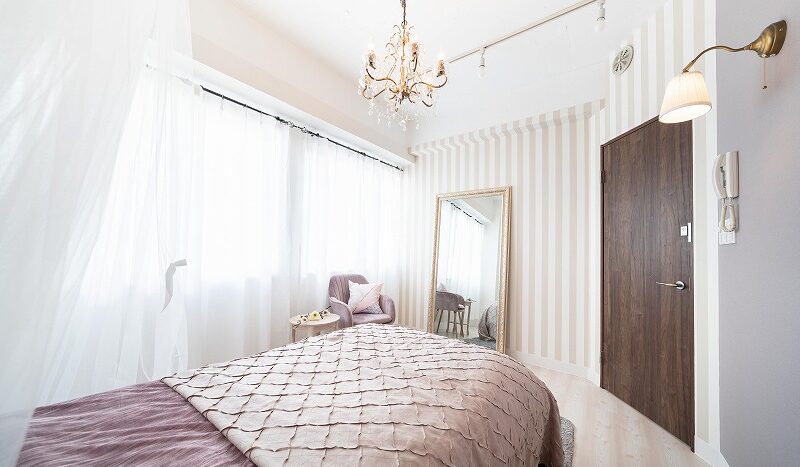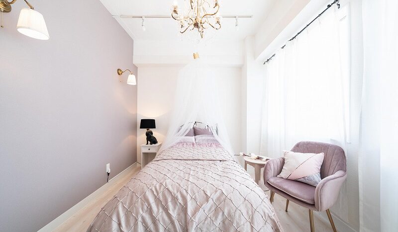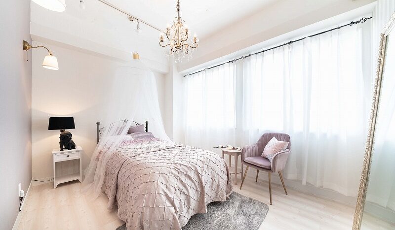 ガーリーをコンセプトに、ベッドをメインにした空間です。日中は窓から日差しが入り、ふんわりとした雰囲気に。明るさにこだわる方にも好評です。